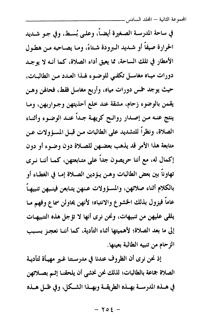 في ساحة المدرسة الصغيرة أيضا، وعلى بسط، وفي جو شديد الحرارة صيفا أو شديد البرودة شتاء وما يصاحبه من هطول الأمطار في تلك الساحة، مما يعيق أداء الصلاة كما أنه لا يوجد دورات مياه مغاسل تكفي للوضوء لهذا العدد من الطالبات، حيث يوجد خمس دورات مياه، وأربع مغاسل فقط، فحالهن وهن يقمن بالوضوء زحام، مشقة عند خلع أحذيتهن وجواربهن، وما ينتج عنه من إصدار روائح كريهة جدا عند الوضوء وأثناء الصلاة، ونظرا للتشديد على الطالبات من قبل المسؤولات عن متابعة هذا الأمر قد يذهب بعضهن للصلاة دون وضوء أو دون إكمال له، مع أننا حريصون جدا على متابعتهن، كما أننا نرى تهاونا بين بعض الطالبات وهن يؤدين الصلاة إما في الغطاء أو بالكلام أثناء صلاتهن، والمسؤولات عنهن يتابعن فينبهن تنبيها عاما ليزول بذلك الخشوع والانتباه لأنهن يحاولن سماع وفهم ما يلقى عليهن من تنبيهات، ونحن نرى أنها لا تؤجل هذه التنبيهات إلى ما بعد الصلاة؟ لأهميتها أثناء التأدية، كما أننا نعجز بسبب الزحام من تنبيه الطالبة بعينها.