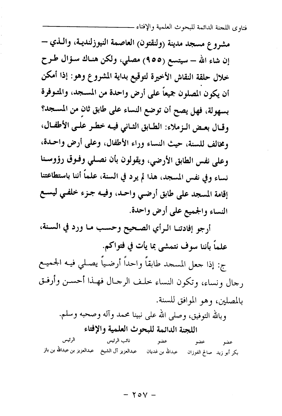 مشروع مسجد مدينة (ولنقتون) العاصمة النيوزلندية، والذي - إن شاء الله - سيتسع (955) مصليا، ولكن هناك سؤال طرح خلال حلقة النقاش الأخيرة لتوقيع بداية المشروع وهو: إذا أمكن أن يكون المصلون جميعا على أرض واحدة من المسجد، والمتوفرة - بسهولة، فهل يصح أن توضع النساء على طابق ثان من المسجد؟ وقال بعض الزملاء: الطابق الثاني فيه خطر على الأطفال، ومخالف للسنة، حيث النساء وراء الأطفال، وعلى أرض واحدة، وعلى نفس الطابق الأرضي، ويقولون بأن نصلي وفوق رؤوسنا نساء وفي نفس المسجد، هذا لم يرد في السنة، علما أننا باستطاعتنا إقامة المسجد على طابق أرضي واحد، وفيه جزء خلفي ليسع النساء والجميع على أرض واحدة.