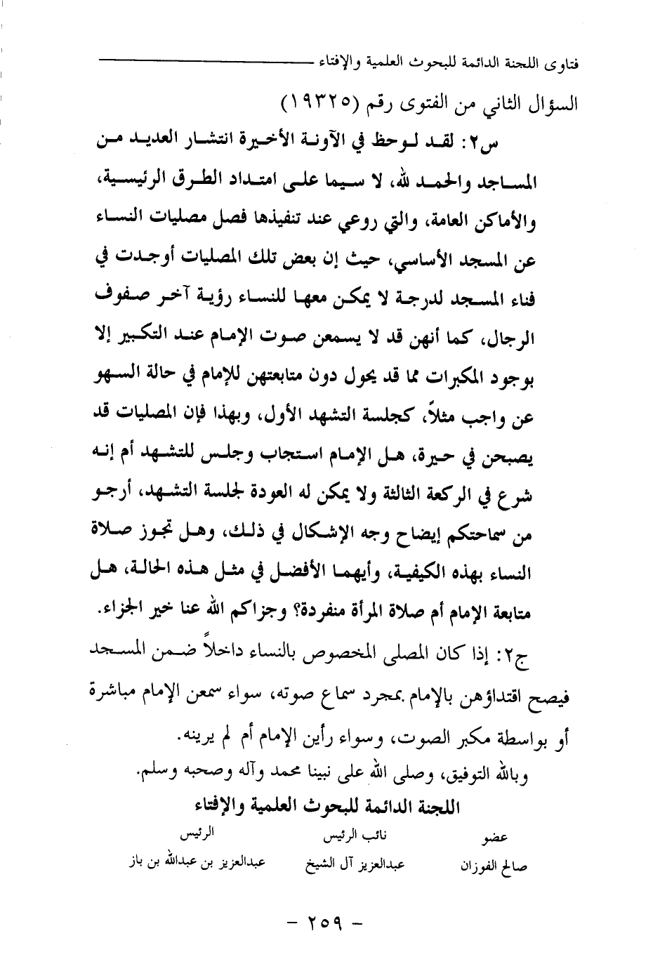 س2: لقد لوحظ في الآونة الأخيرة انتشار العديد من المساجد والحمد لله، لا سيما على امتداد الطرق الرئيسية، والأماكن العامة، والتي روعي عند تنفيذها فصل مصليات النساء عن المسجد الأساسي، حيث إن بعض تلك المصليات أوجدت في فناء المسجد لدرجة لا يمكن معها للنساء رؤية آخر صفوف الرجال، كما أنهن قد لا يسمعن صوت الإمام عند التكبير إلا بوجود المكبرات مما قد يحول دون متابعتهن للإمام في حالة السهو عن واجب مثلا، كجلسة التشهد الأول، وبهذا فإن المصليات قد يصبحن في حيرة، هل الإمام استجاب وجلس للتشهد أم أنه شرع في الركعة الثالثة ولا يمكن له العودة لجلسة التشهد، أرجو من سماحتكم إيضاح وجه الإشكال في ذلك، وهل تجوز صلاة النساء بهذه الكيفية، وأيهما الأفضل في مثل هذه الحالة، هل متابعة الإمام أم صلاة المرأة منفردة؟ وجزاكم الله عنا خير الجزاء.