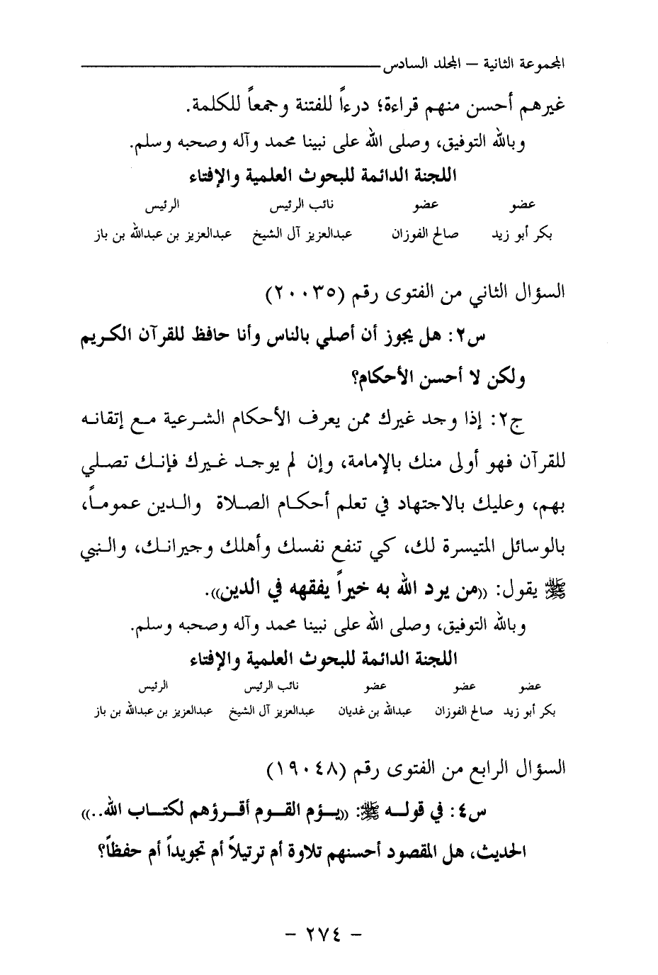 س 4: في قوله صلى الله عليه وسلم: «يؤم القوم أقرؤهم لكتاب الله (¬1) » . . الحديث، هل المقصود أحسنهم تلاوة أم ترتيلا أم تجويدا أم حفظا؟