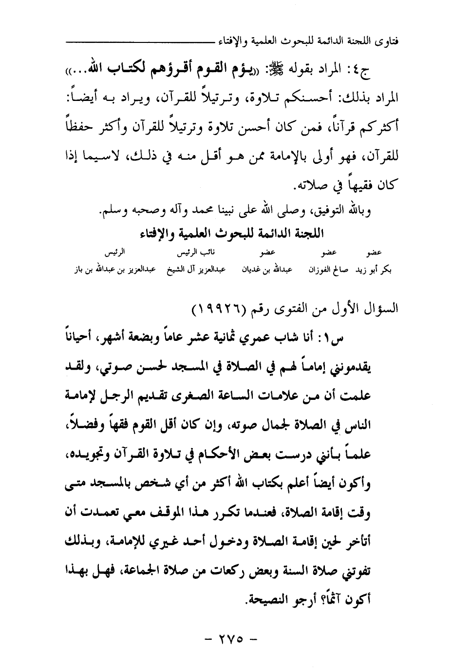 ج4: المراد بقوله صلى الله عليه وسلم: «يؤم القوم أقرؤهم لكتاب الله (¬1) » . . . المراد بذلك: أحسنكم تلاوة، وترتيلا للقرآن، ويراد به أيضا: أكثركم قرآنا، فمن كان أحسن تلاوة وترتيلا للقرآن وأكثر حفظا للقرآن، فهو أولى بالإمامة ممن هو أقل منه في ذلك، لا سيما إذا كان فقيها في صلاته.