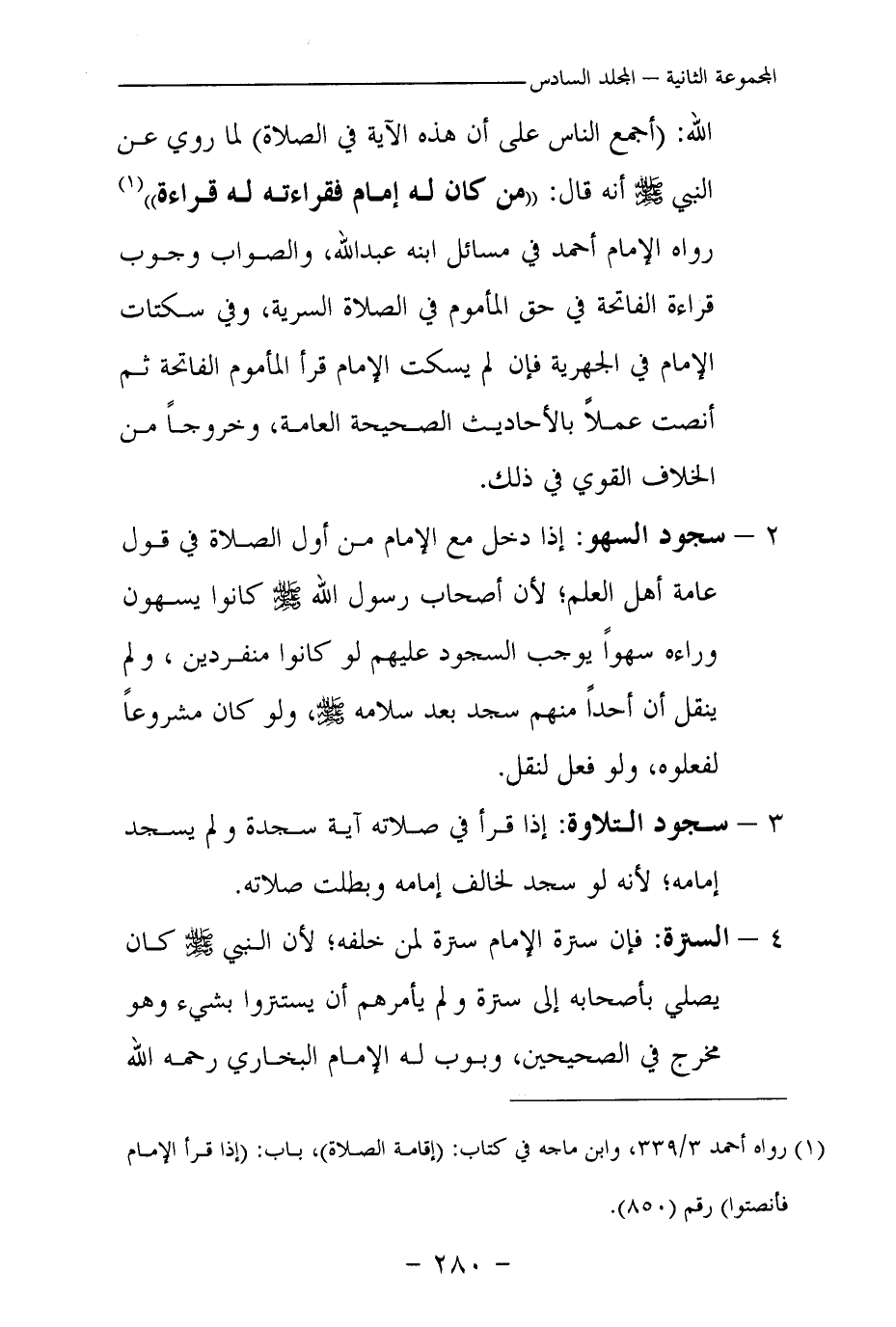 الله: (أجمع الناس على أن هذه الآية في الصلاة) لما روي عن النبي صلى الله عليه وسلم أنه قال: «من كان له إمام فقراءته له قراءة (¬1) » رواه الإمام أحمد في مسائل ابنه عبد الله، والصواب وجوب قراءة الفاتحة في حق المأموم في الصلاة السرية، وفي سكتات الإمام في الجهرية، فإن لم يسكت الإمام قرأ المأموم الفاتحة ثم أنصت عملا بالأحاديث الصحيحة العامة، وخروجا من الخلاف القوي في ذلك.