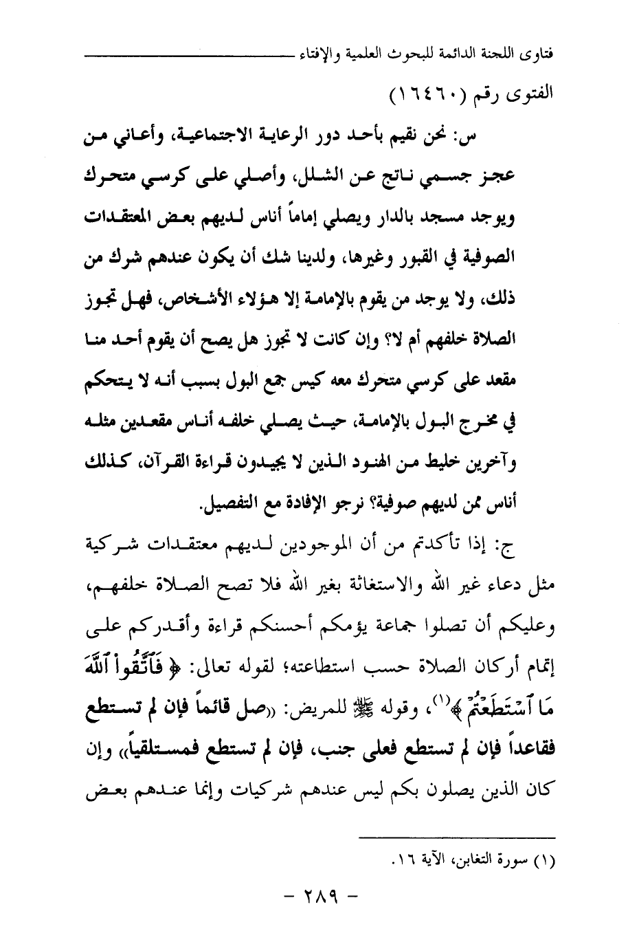 ج: إذا تأكدتم من أن الموجودين لديهم معتقدات شركية مثل دعاء غير الله والاستغاثة بغير الله فلا تصح الصلاة خلفهم، وعليكم أن تصلوا جماعة يؤمكم أحسنكم قراءة وأقدركم على إتمام أركان الصلاة حسب استطاعته؛ لقوله تعالى: {فَاتَّقُوا اللَّهَ مَا اسْتَطَعْتُمْ} (¬1) ، وقوله صلى الله عليه وسلم للمريض: «صل قائما فإن لم تستطع فقاعدا فإن لم تستطع فعلى جنب، فإن لم تستطع فمستلقيا (¬2) » وإن كان الذين يصلون بكم ليس عندهم شركيات وإنما عندهم بعض