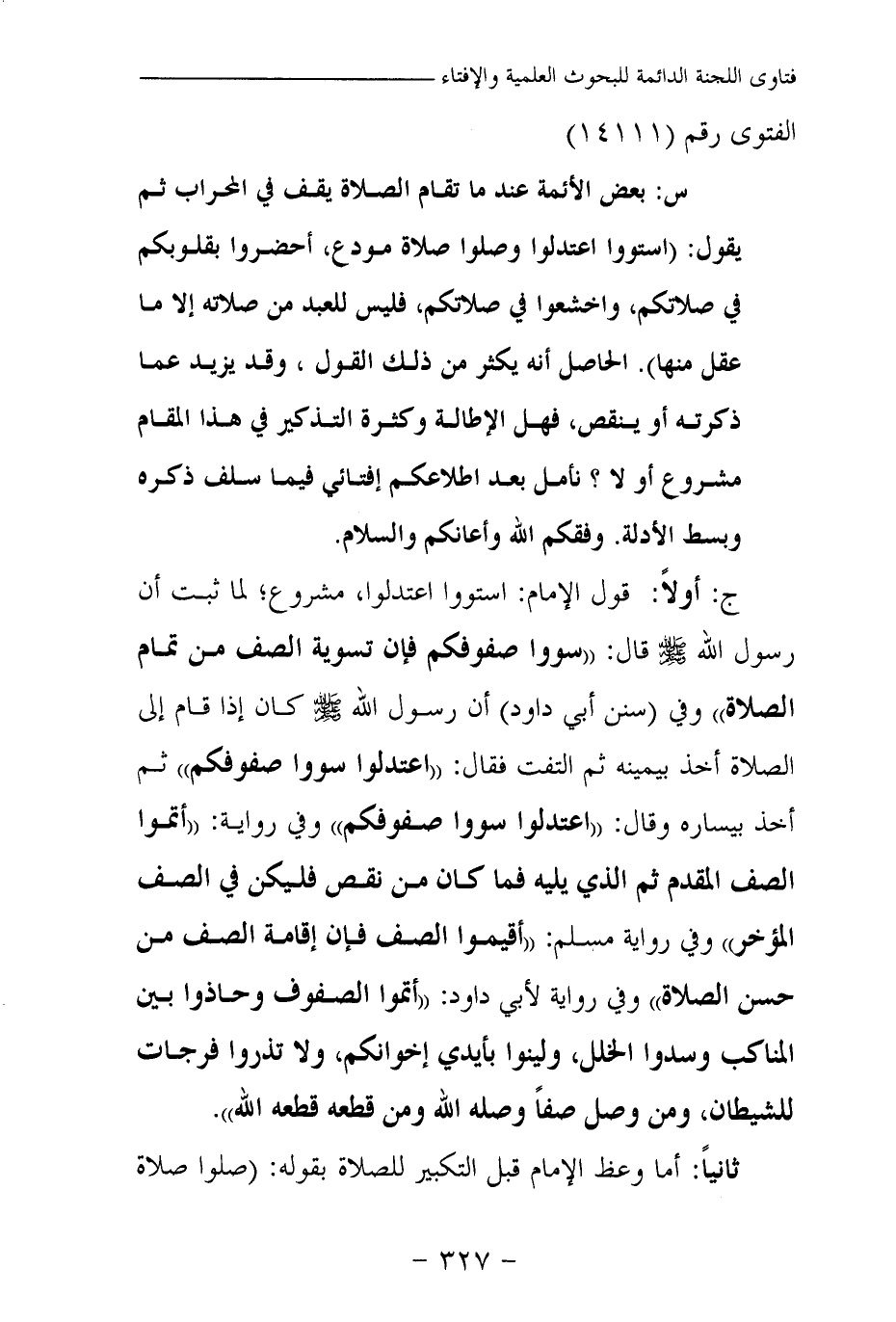 ج: أولا: قول الإمام: استووا اعتدلوا، مشروع؛ لما ثبت أن رسول الله صلى الله عليه وسلم قال: «سووا صفوفكم فإن تسوية الصف من تمام الصلاة (¬1) » وفي (سنن أبي داود) أن رسول الله صلى الله عليه وسلم كان إذا قام إلى الصلاة أخذ بيمينه ثم التفت فقال: «اعتدلوا سووا صفوفكم) ثم أخذ بيساره وقال: (اعتدلوا سووا صفوفكم (¬2) » وفي رواية: «أتموا الصف المقدم ثم الذي يليه فما كان من نقص فليكن في الصف المؤخر (¬3) » وفي رواية مسلم: «أقيموا الصف فإن إقامة الصف من حسن الصلاة (¬4) » وفي رواية لأبي داود: «أتموا الصفوف وحاذوا بين المناكب وسدوا الخلل، ولينوا بأيدي إخوانكم، ولا تذروا فرجات للشيطان، ومن وصل صفا وصله الله ومن قطعه قطعه الله (¬5) » .