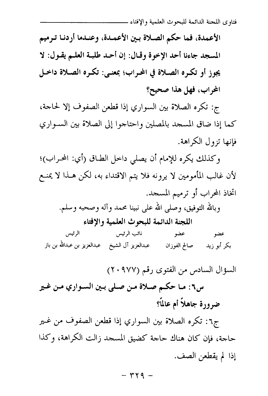 س6: ما حكم صلاة من صلى بين السواري من غير ضرورة جاهلا أم عالما؟