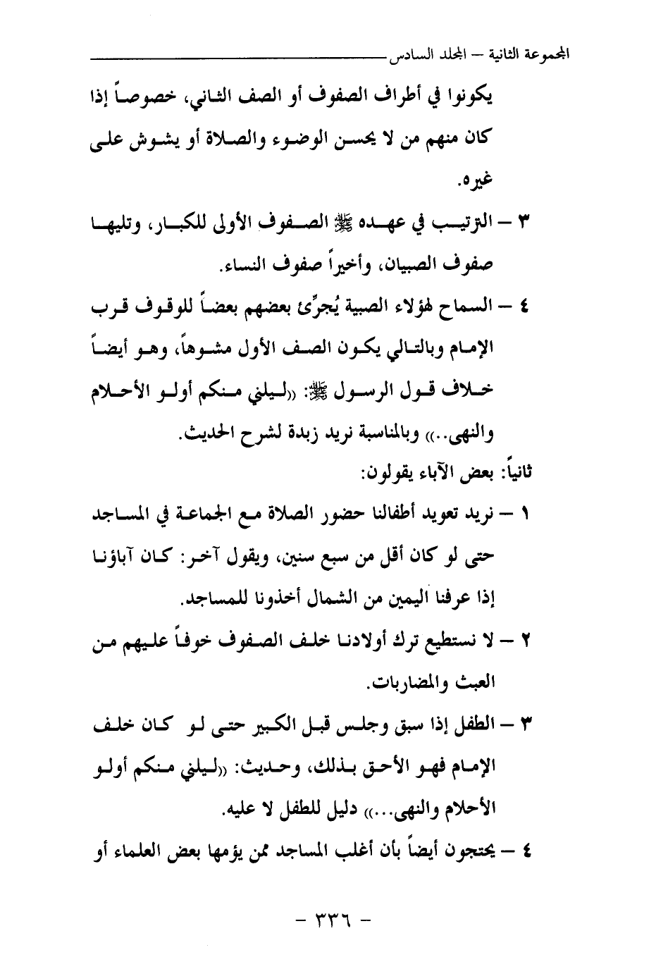 4 - السماح لهؤلاء الصبية يجرئ بعضهم بعضا للوقوف قرب الإمام وبالتالي يكون الصف الأول مشوها، وهو أيضا خلاف قول الرسول صلى الله عليه وسلم: «ليلني منكم أولو الأحلام والنهى. (¬1) » وبالمناسبة نريد زبدة لشرح الحديث.