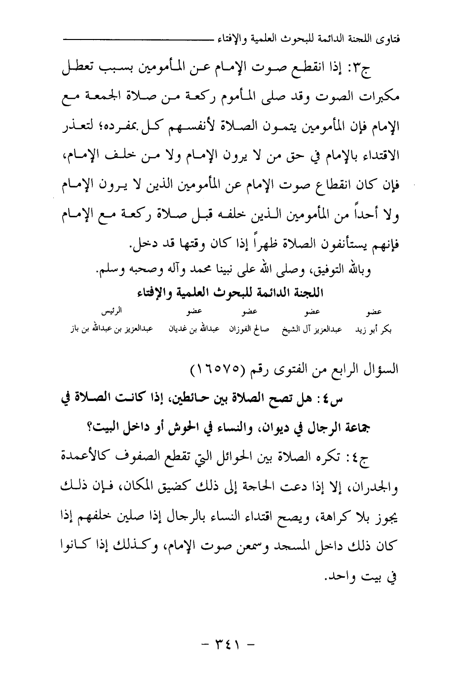 س4: هل تصح الصلاة بين حائطين، إذا كانت الصلاة في جماعة الرجال في ديوان، والنساء في الحوش أو داخل البيت؟