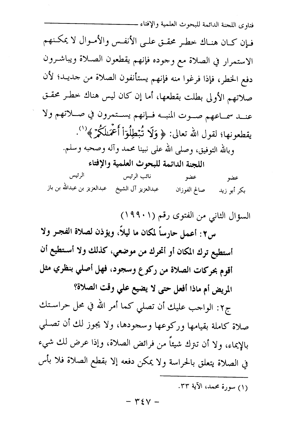 ج2: الواجب عليك أن تصلي كما أمر الله في محل حراستك صلاة كاملة بقيامها وركوعها وسجودها، ولا يجوز لك أن تصلي بالإيماء، ولا أن تترك شيئا من فرائض الصلاة، وإذا عرض لك شيء في الصلاة يتعلق بالحراسة ولا يمكن دفعه إلا بقطع الصلاة فلا بأس