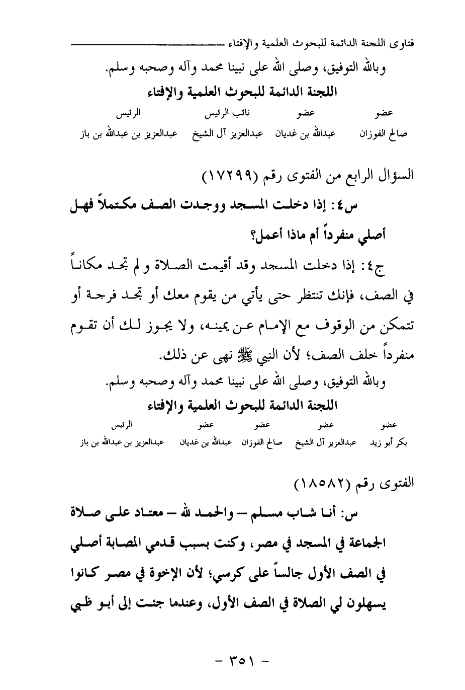 س4: إذا دخلت المسجد ووجدت الصف مكتملا فهل أصلي منفردا أم ماذا أعمل؟