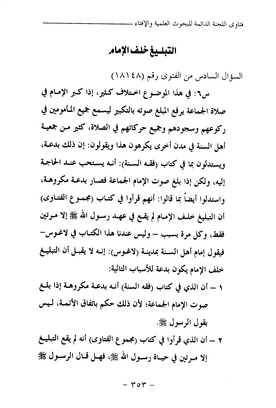 س6: في هذا الموضوع اختلاف كثير، إذا كبر الإمام في صلاة الجماعة يرفع المبلغ صوته بالتكبير ليسمع جميع المأمومين في ركوعهم وسجودهم وجميع حركاتهم في الصلاة، كثير من جمعية أهل السنة في مدن أخرى يكرهون هذا ويقولون: إن ذلك بدعة، ويستدلون بما في كتاب (فقه السنة) : أنه يستحب عند الحاجة إليه، ولكن إذا بلغ صوت الإمام الجماعة فصار بدعة مكروهة، واستدلوا أيضا بما قالوا: إنهم قرأوا في كتاب (مجموع الفتاوى) أن التبليغ خلف الإمام لم يقع في عهد رسول الله صلى الله عليه وسلم إلا مرتين فقط، وكل مرة بسبب - وليس عندنا هذا الكتاب في لاغوس - فيقول إمام أهل السنة بمدينة (لاغوس) : " إنه لا يقبل أن التبليغ خلف الإمام يكون بدعة للأسباب التالية: