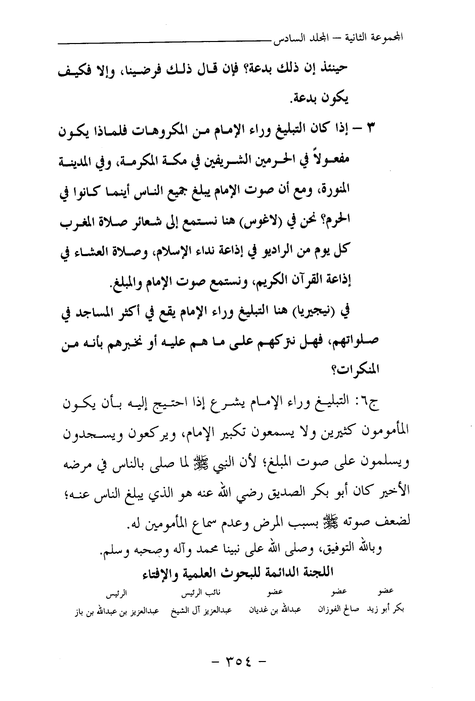 3 - إذا كان التبليغ وراء الإمام من المكروهات فلماذا يكون مفعولا في الحرمين الشريفين في مكة المكرمة، وفي المدينة المنورة، ومع أن صوت الإمام يبلغ جميع الناس أينما كانوا في الحرم؟ نحن في (لاغوس) هنا نستمع إلى شعائر صلاة المغرب كل يوم من الراديو في إذاعة نداء الإسلام، وصلاة العشاء في إذاعة القرآن الكريم، ونستمع صوت الإمام والمبلغ.