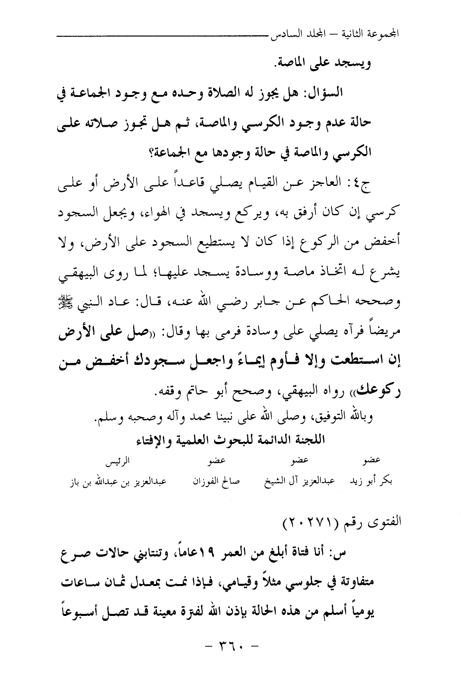 السؤال: هل يجوز له الصلاة وحده مع وجود الجماعة في حالة عدم وجود الكرسي والماصة، ثم هل تجوز صلاته على الكرسي والماصة في حالة وجودها مع الجماعة؟