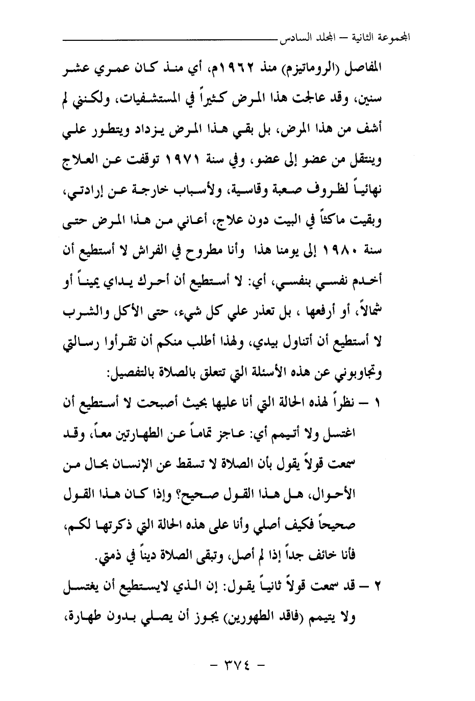المفاصل (الروماتيزم) منذ 1962 م، أي منذ كان عمري عشر سنين، وقد عالجت هذا المرض كثيرا في المستشفيات، ولكنني لم أشف من هذا المرض، بل بقي هذا المرض يزداد ويتطور علي وينتقل من عضو إلى عضو، وفي سنة 1971 توقفت عن العلاج نهائيا لظروف صعبة وقاسية، ولأسباب خارجة عن إرادتي، وبقيت ماكثا في البيت دون علاج، أعاني من هذا المرض حتى سنة 1980 إلى يومنا هذا وأنا مطروح في الفراش لا أستطيع أن أخدم نفسي بنفسي، أي: لا أستطيع أن أحرك يداي يمينا أو شمالا، أو أرفعها، بل تعذر علي كل شيء، حتى الأكل والشرب لا أستطيع أن أتناول بيدي، ولهذا أطلب منكم أن تقرأوا رسالتي وتجاوبوني عن هذه الأسئلة التي تتعلق بالصلاة بالتفصيل: