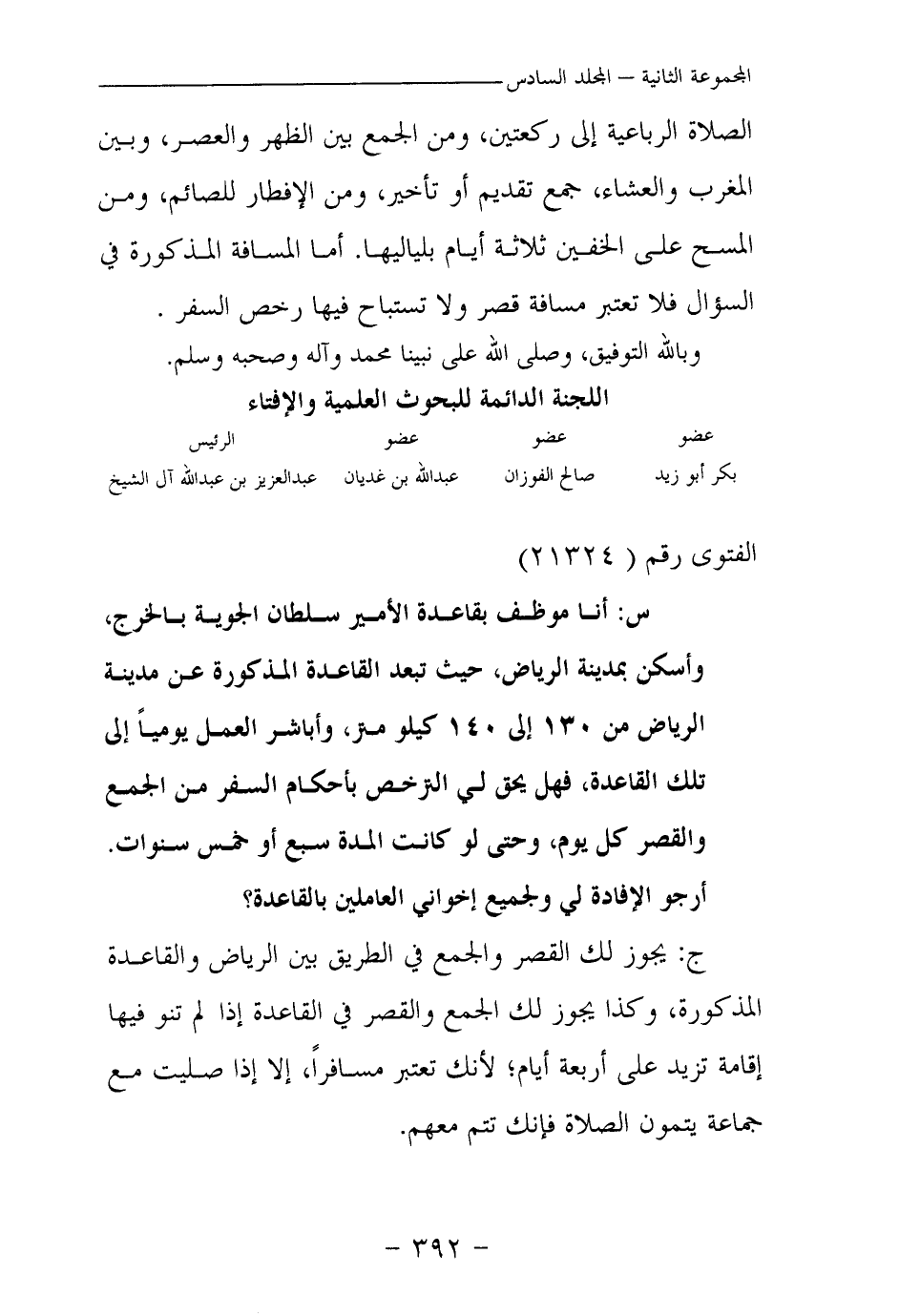 س: أنا موظف بقاعدة الأمير سلطان الجوية بالخرج، وأسكن بمدينة الرياض، حيث تبعد القاعدة المذكورة عن مدينة الرياض من 130 إلى 140 كيلو متر، وأباشر العمل يوميا إلى تلك القاعدة، فهل يحق لي الترخص بأحكام السفر من الجمع والقصر كل يوم، وحتى لو كانت المدة سبع أو خمس سنوات. أرجو الإفادة لي ولجميع إخواني العاملين بالقاعدة؟