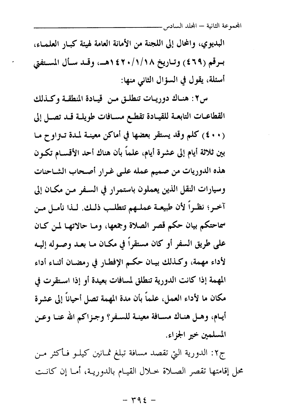 س 2: هناك دوريات تنطلق من قيادة المنطقة وكذلك القطاعات التابعة للقيادة تقطع مسافات طويلة قد تصل إلى (400) كلم وقد يستقر بعضها في أماكن معينة لمدة تتراوح ما بين ثلاثة أيام إلى عشرة أيام، علما بأن هناك أحد الأقسام تكون هذه الدوريات من صميم عمله على غرار أصحاب الشاحنات وسيارات النقل الذين يعملون باستمرار في السفر من مكان إلى آخر؛ نظرا لأن طبيعة عملهم تتطلب ذلك. لذا نأمل من سماحتكم بيان حكم قصر الصلاة وجمعها، وما حالاتها لمن كان على طريق السفر أو كان مستقرا في مكان ما بعد وصوله إليه لأداء مهمة، وكذلك بيان حكم الإفطار في رمضان أثناء أداء المهمة إذا كانت الدورية تنطلق لمسافات بعيدة أو إذا استقرت في مكان ما لأداء العمل، علما بأن مدة المهمة تصل أحيانا إلى عشرة أيام، وهل هناك مسافة معينة للسفر؟ وجزاكم الله عنا وعن المسلمين خير الجزاء.