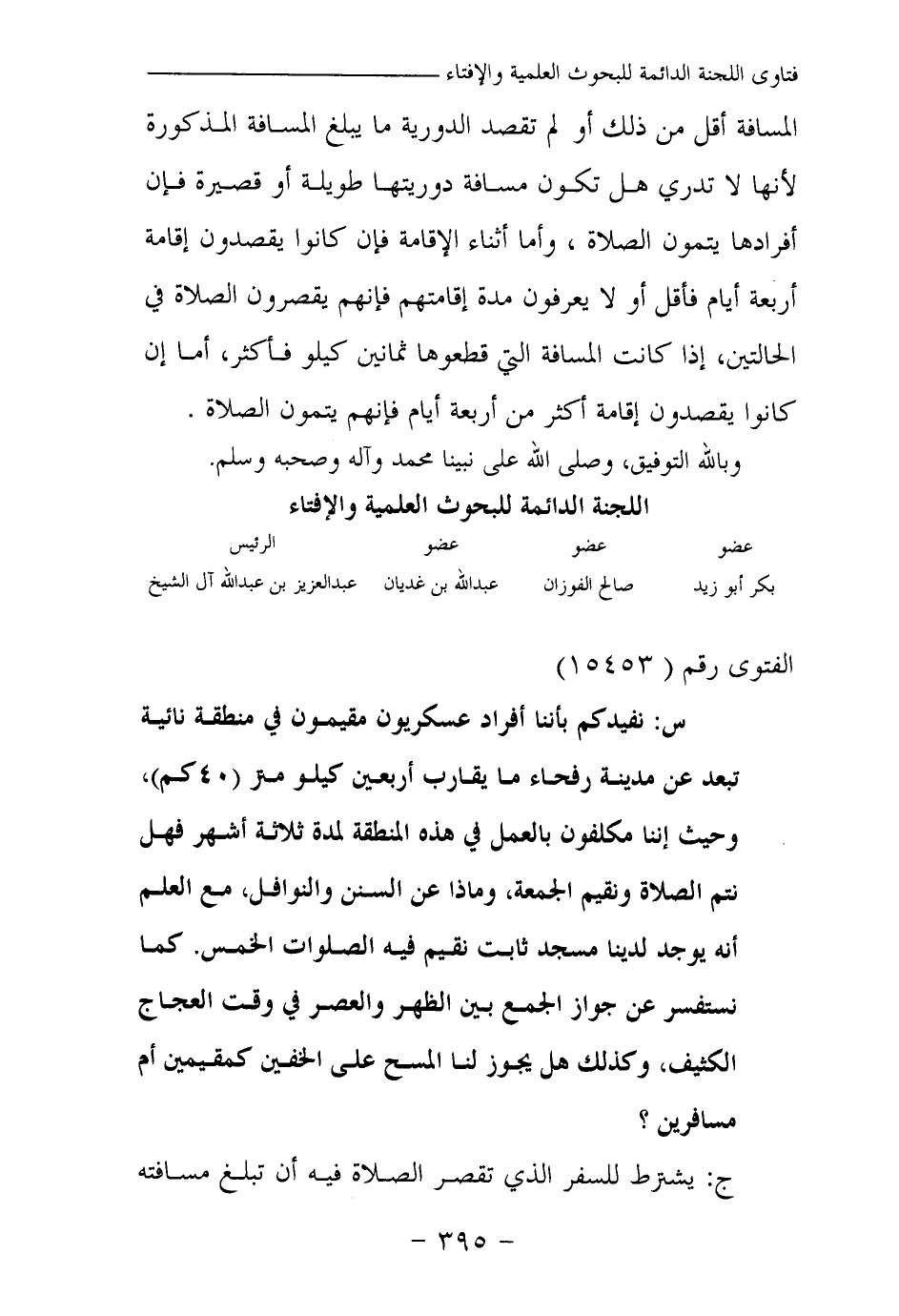 المسافة أقل من ذلك أو لم تقصد الدورية ما يبلغ المسافة المذكورة لأنها لا تدري هل تكون مسافة دوريتها طويلة أو قصيرة فإن أفرادها يتمون الصلاة، وأما أثناء الإقامة فإن كانوا يقصدون إقامة أربعة أيام فأقل أو لا يعرفون مدة إقامتهم فإنهم يقصرون الصلاة في الحالتين، إذا كانت المسافة التي قطعوها ثمانين كيلو فأكثر، أما إن كانوا يقصدون إقامة أكثر من أربعة أيام فإنهم يتمون الصلاة.