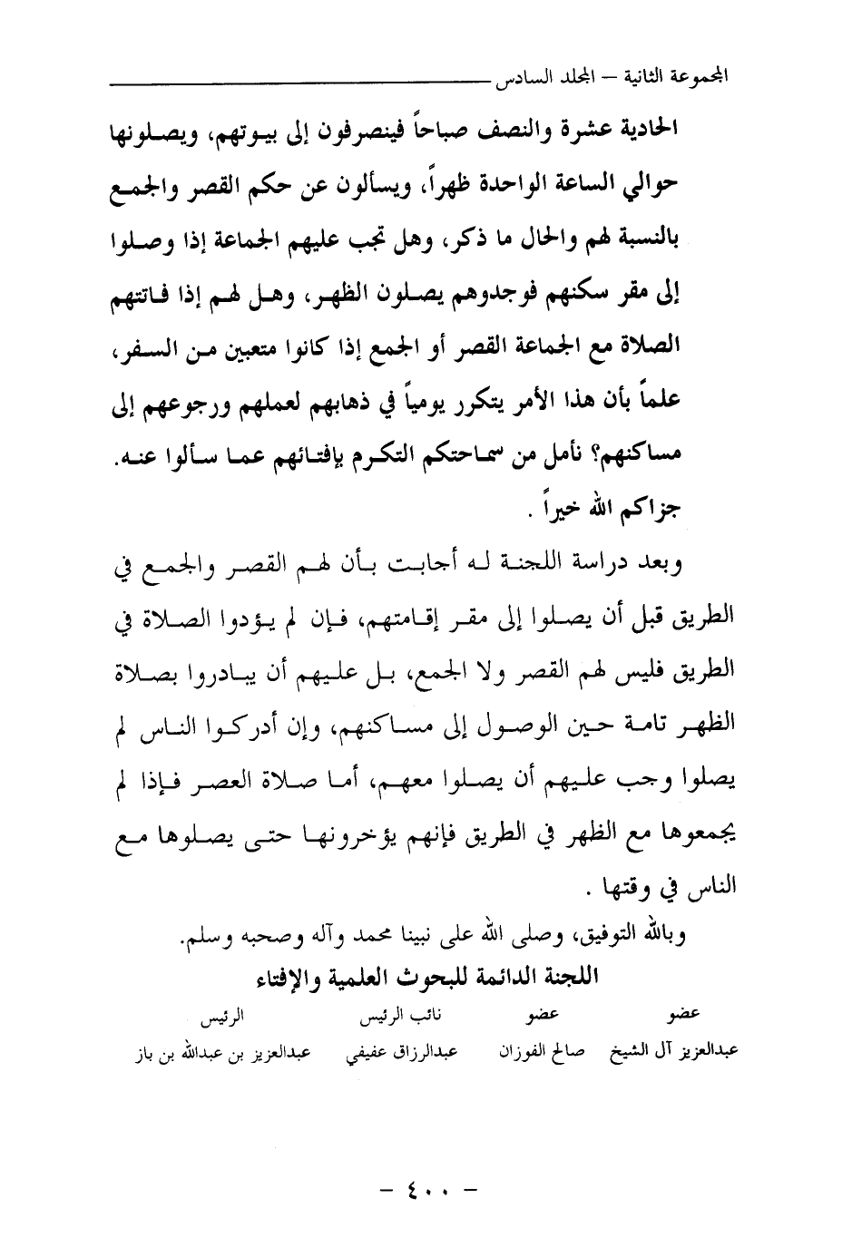 وبعد دراسة اللجنة له أجابت بأن لهم القصر والجمع في الطريق قبل أن يصلوا إلى مقر إقامتهم، فإن لم يؤدوا الصلاة في الطريق فليس لهم القصر ولا الجمع، بل عليهم أن يبادروا بصلاة الظهر تامة حين الوصول إلى مساكنهم، وإن أدركوا الناس لم يصلوا وجب عليهم أن يصلوا معهم، أما صلاة العصر فإذا لم يجمعوها مع الظهر في الطريق فإنهم يؤخرونها حتى يصلوها مع الناس في وقتها.