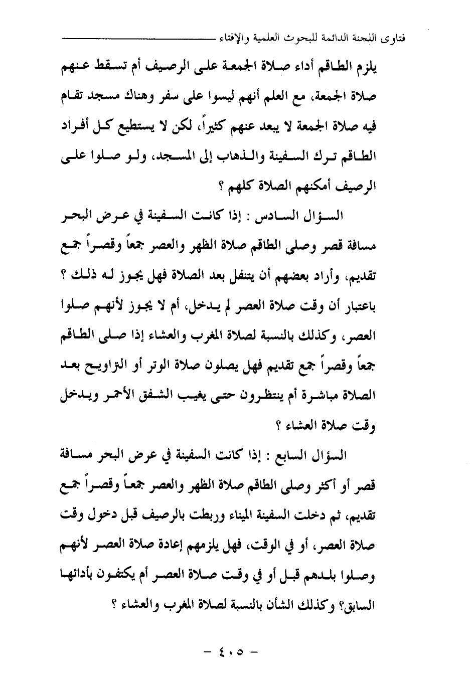 السؤال السابع: إذا كانت السفينة في عرض البحر مسافة قصر أو أكثر وصلى الطاقم صلاة الظهر والعصر جمعا وقصرا جمع تقديم، ثم دخلت السفينة الميناء وربطت بالرصيف قبل دخول وقت صلاة العصر، أو في الوقت، فهل يلزمهم إعادة صلاة العصر لأنهم وصلوا بلدهم قبل أو في وقت صلاة العصر أم يكتفون بأدائها السابق؟ وكذلك الشأن بالنسبة لصلاة المغرب والعشاء؟