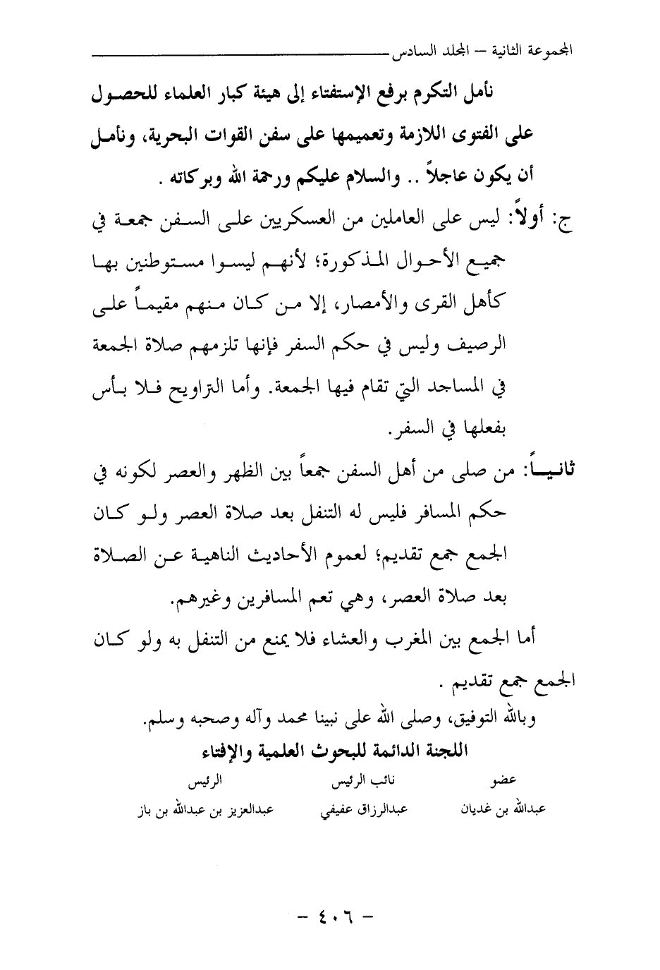 ج: أولا: ليس على العاملين من العسكريين على السفن جمعة في جميع الأحوال المذكورة، لأنهم ليسوا مستوطنين بها كأهل القرى والأمصار، إلا من كان منهم مقيما على الرصيف وليس في حكم السفر فإنها تلزمهم صلاة الجمعة في المساجد التي تقام فيها الجمعة. وأما التراويح فلا بأس بفعلها في السفر.