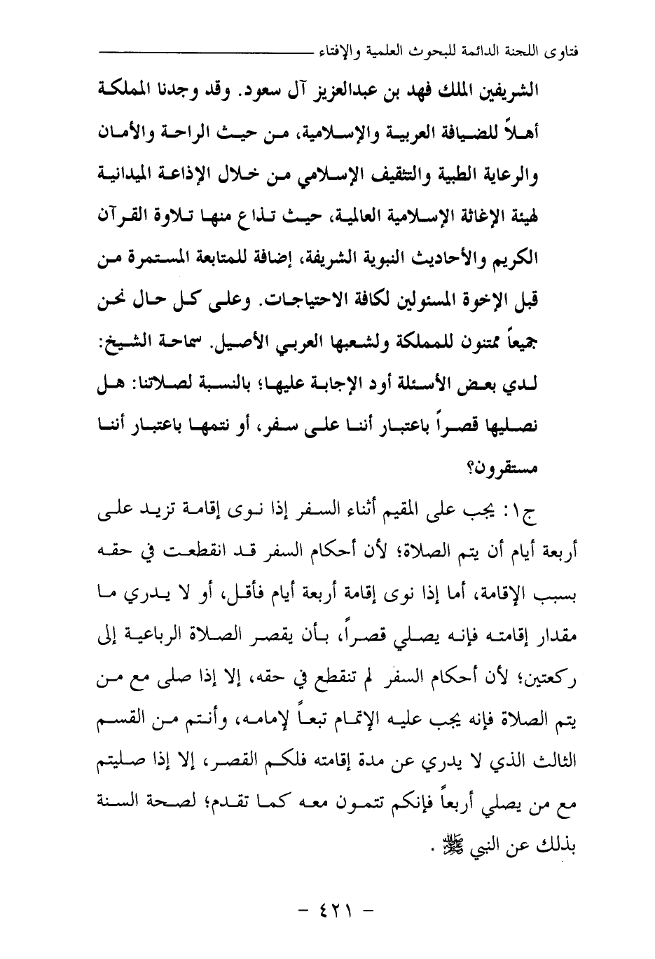 الشريفين الملك فهد بن عبد العزيز آل سعود. وقد وجدنا المملكة أهلا للضيافة العربية والإسلامية، من حيث الراحة والأمان والرعاية الطبية والتثقيف الإسلامي من خلال الإذاعة الميدانية لهيئة الإغاثة الإسلامية العالمية، حيث تذاع منها تلاوة القرآن الكريم والأحاديث النبوية الشريفة، إضافة للمتابعة المستمرة من قبل الإخوة المسئولين لكافة الاحتياجات. وعلى كل حال نحن جميعا ممتنون للمملكة ولشعبها العربي الأصيل. سماحة الشيخ: لدي بعض الأسئلة أود الإجابة عليها؛ بالنسبة لصلاتنا: هل نصليها قصرا باعتبار أننا على سفر، أو نتمها باعتبار أننا مستقرون؟