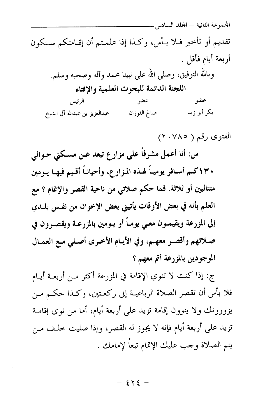 س: أنا أعمل مشرفا على مزارع تبعد عن مسكني حوالي 130 كم أسافر يوميا لهذه المزارع، وأحيانا أقيم فيها يومين متتاليين أو ثلاثة. فما حكم صلاتي من ناحية القصر والإتمام؟ مع العلم بأنه في بعض الأوقات يأتيني بعض الإخوان من نفس بلدي إلى المزرعة ويقيمون معي يوما أو يومين بالمزرعة ويقصرون في صلاتهم وأقصر معهم، وفي الأيام الأخرى أصلي مع العمال الموجودين بالمزرعة أتم معهم؟