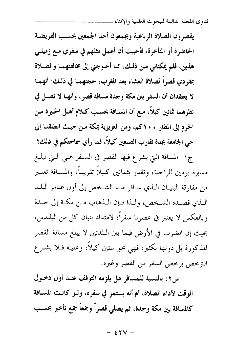 يقصرون الصلاة الرباعية ويجمعون أحد الجمعين بحسب الفريضة الحاضرة أو المتأخرة، فأحببت أن أعمل مثلهم في سفري مع زميلي هذين، فلم يمكناني من ذلك، مما أحوجني إلى مخالفتهما والصلاة بمفردي قصرا لصلاة العشاء بعد المغرب، حجتهما في ذلك: أنهما لا يعتقدان أن السفر بين مكة وجدة مسافة قصر، وأنها لا تصل في نظرهما ثمانين كيلا، مع أن المسافة بحسب كلام أهل الخبرة من الحرم إلى المطار 100 كم، ومن العزيزية بمكة من حيث انطلقنا إلى حي الجامعة بجدة تقارب التسعين كيلا، فما رأي سماحتكم في ذلك؟