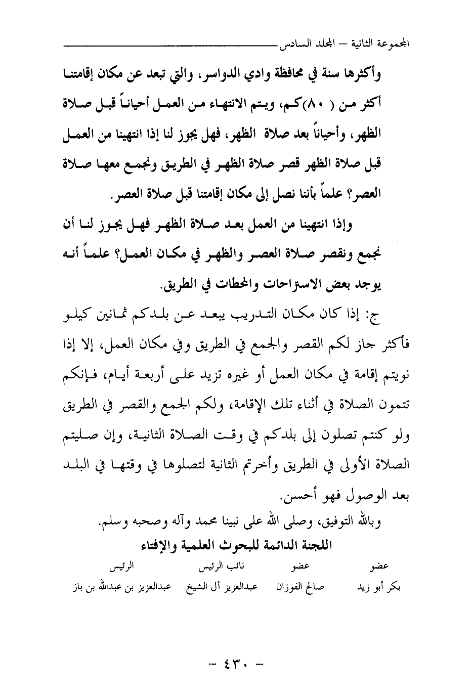 ج: إذا كان مكان التدريب يبعد عن بلدكم ثمانين كيلو فأكثر جاز لكم القصر والجمع في الطريق وفي مكان العمل، إلا إذا نويتم إقامة في مكان العمل أو غيره تزيد على أربعة أيام، فإنكم تتمون الصلاة في أثناء تلك الإقامة، ولكم الجمع والقصر في الطريق ولو كنتم تصلون إلى بلدكم في وقت الصلاة الثانية، وإن صليتم الصلاة الأولى في الطريق وأخرتم الثانية لتصلوها في وقتها في البلد بعد الوصول فهو أحسن.