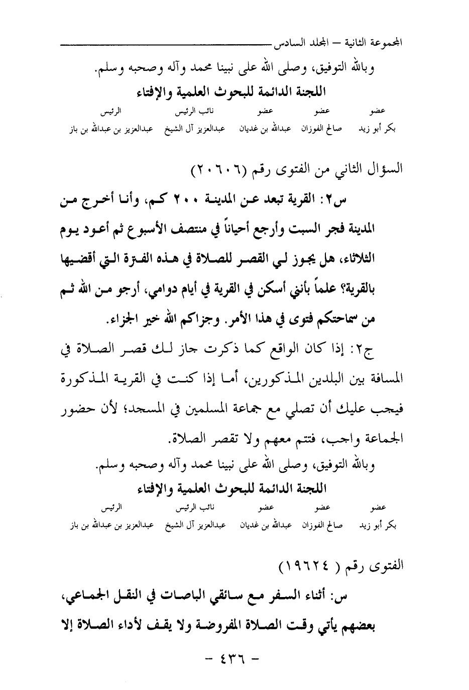 س 2: القرية تبعد عن المدينة 200 كم، وأنا أخرج من المدينة فجر السبت وأرجع أحيانا في منتصف الأسبوع ثم أعود يوم الثلاثاء، هل يجوز لي القصر للصلاة في هذه الفترة التي أقضيها بالقرية؟ علما بأنني أسكن في القرية في أيام دوامي، أرجو من الله ثم من سماحتكم فتوى في هذا الأمر وجزاكم الله خير الجزاء.