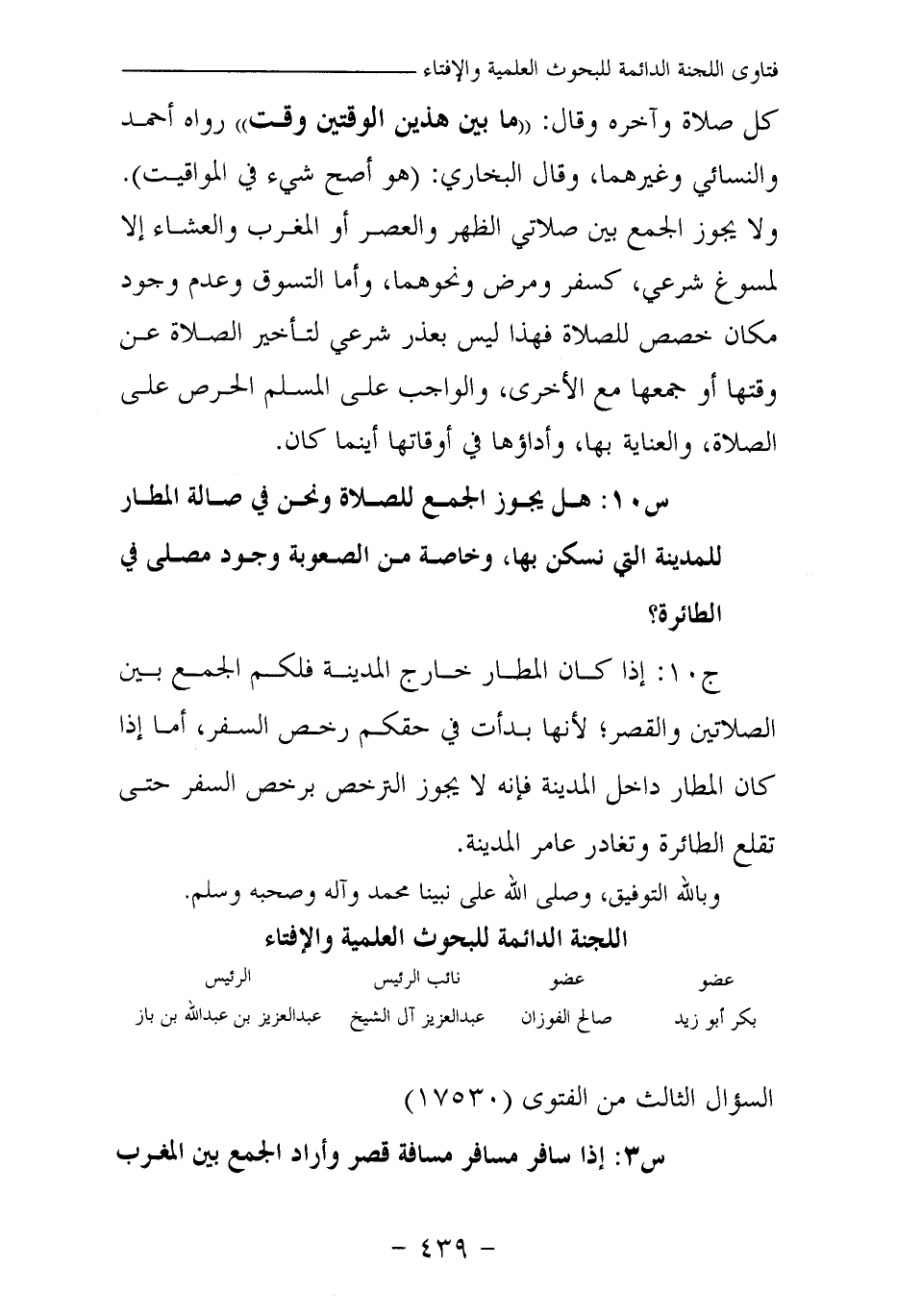س 10: هل يجوز الجمع للصلاة ونحن في صالة المطار للمدينة التي نسكن بها، وخاصة من الصعوبة وجود مصلى في الطائرة؟
