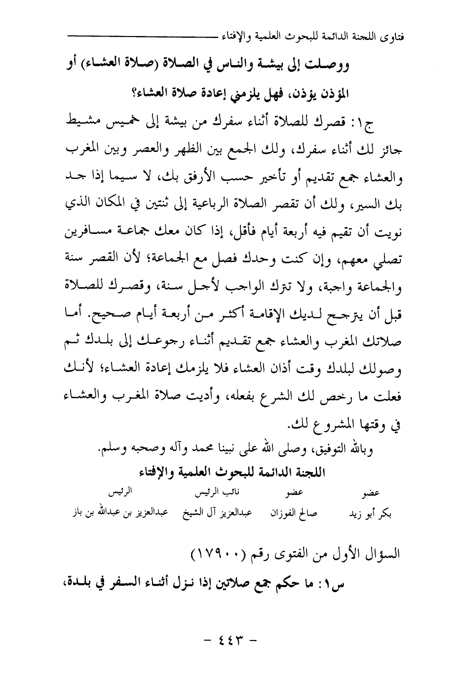 س 1: ما حكم جمع صلاتين إذا نزل أثناء السفر في بلدة،