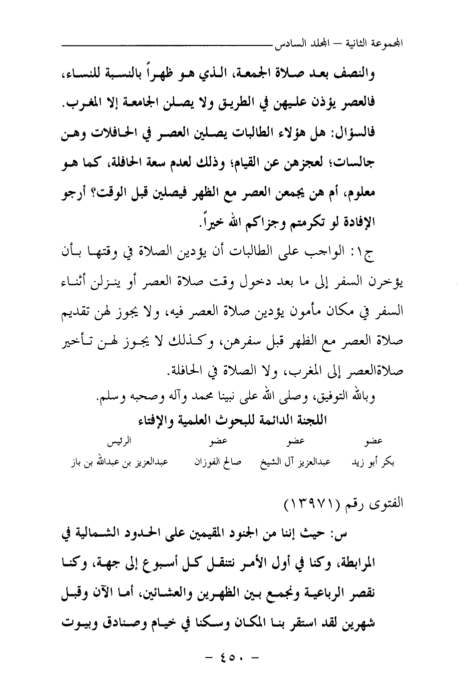 س: حيث إننا من الجنود المقيمين على الحدود الشمالية في المرابطة، وكنا في أول الأمر نتنقل كل أسبوع إلى جهة، وكنا نقصر الرباعية ونجمع بين الظهرين والعشائين، أما الآن وقبل شهرين لقد استقر بنا المكان وسكنا في خيام وصنادق وبيوت
