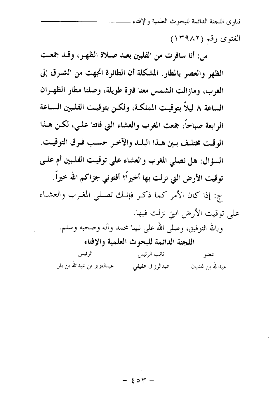 س: أنا سافرت من الفلبين بعد صلاة الظهر، وقد جمعت الظهر والعصر بالمطار. المشكلة أن الطائرة اتجهت من الشرق إلى الغرب، ومازالت الشمس معنا فترة طويلة، وصلنا مطار الظهران الساعة 8 ليلا بتوقيت المملكة، ولكن بتوقيت الفلبين الساعة الرابعة صباحا، جمعت المغرب والعشاء التي فاتتا علي، لكن هذا الوقت مختلف بين هذا البلد والآخر حسب فرق التوقيت. السؤال: هل نصلي المغرب والعشاء على توقيت الفلبين أم على توقيت الأرض التي نزلت بها أخيرا؟ أفتوني جزاكم الله خيرا.