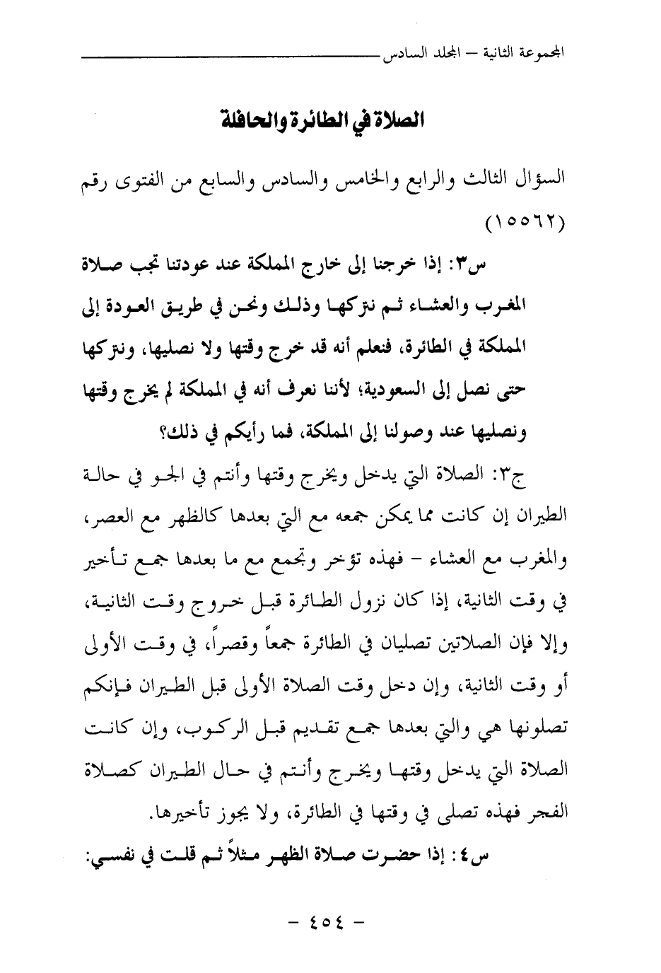 ج 3: الصلاة التي يدخل ويخرج وقتها وأنتم في الجو في حالة الطيران إن كانت مما يمكن جمعه مع التي بعدها كالظهر مع العصر، والمغرب مع العشاء - فهذه تؤخر وتجمع مع ما بعدها جمع تأخير في وقت الثانية، إذا كان نزول الطائرة قبل خروج وقت الثانية، وإلا فإن الصلاتين تصليان في الطائرة جمعا وقصرا، في وقت الأولى أو وقت الثانية، وإن دخل وقت الصلاة الأولى قبل الطيران فإنكم تصلونها هي والتي بعدها جمع تقديم قبل الركوب، وإن كانت الصلاة التي يدخل وقتها ويخرج وأنتم في حال الطيران كصلاة الفجر فهذه تصلى في وقتها في الطائرة، ولا يجوز تأخيرها.