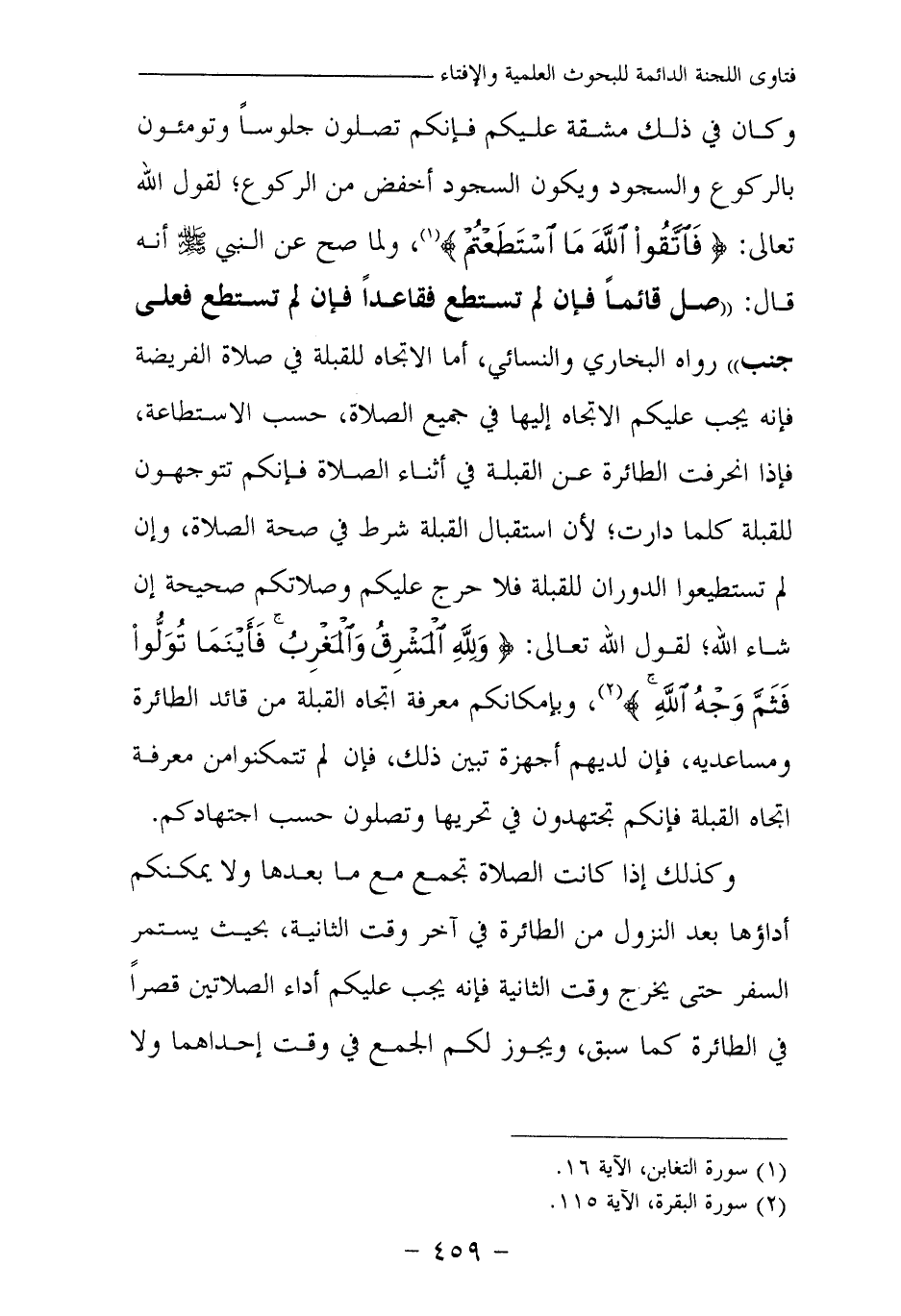 وكان في ذلك مشقة عليكم فإنكم تصلون جلوسا وتومئون بالركوع والسجود ويكون السجود أخفض من الركوع؛ لقول الله تعالى: {فَاتَّقُوا اللَّهَ مَا اسْتَطَعْتُمْ} (¬1) ، ولما صح عن النبي صلى الله عليه وسلم أنه قال: «صل قائما فإن لم تستطع فقاعدا فإن لم تستطع فعلى جنب (¬2) » رواه البخاري والنسائي، أما الاتجاه للقبلة في صلاة الفريضة فإنه يجب عليكم الاتجاه إليها في جميع الصلاة، حسب الاستطاعة، فإذا انحرفت الطائرة عن القبلة في أثناء الصلاة فإنكم تتوجهون للقبلة كلما دارت؛ لأن استقبال القبلة شرط في صحة الصلاة، وإن لم تستطيعوا الدوران للقبلة فلا حرج عليكم وصلاتكم صحيحة إن شاء الله؛ لقول الله تعالى: {وَلِلَّهِ الْمَشْرِقُ وَالْمَغْرِبُ فَأَيْنَمَا تُوَلُّوا فَثَمَّ وَجْهُ اللَّهِ} (¬3) ، وبإمكانكم معرفة اتجاه القبلة من قائد الطائرة ومساعديه، فإن لديهم أجهزة تبين ذلك، فإن لم تتمكنوا من معرفة اتجاه القبلة فإنكم تجتهدون في تحريها وتصلون حسب اجتهادكم.