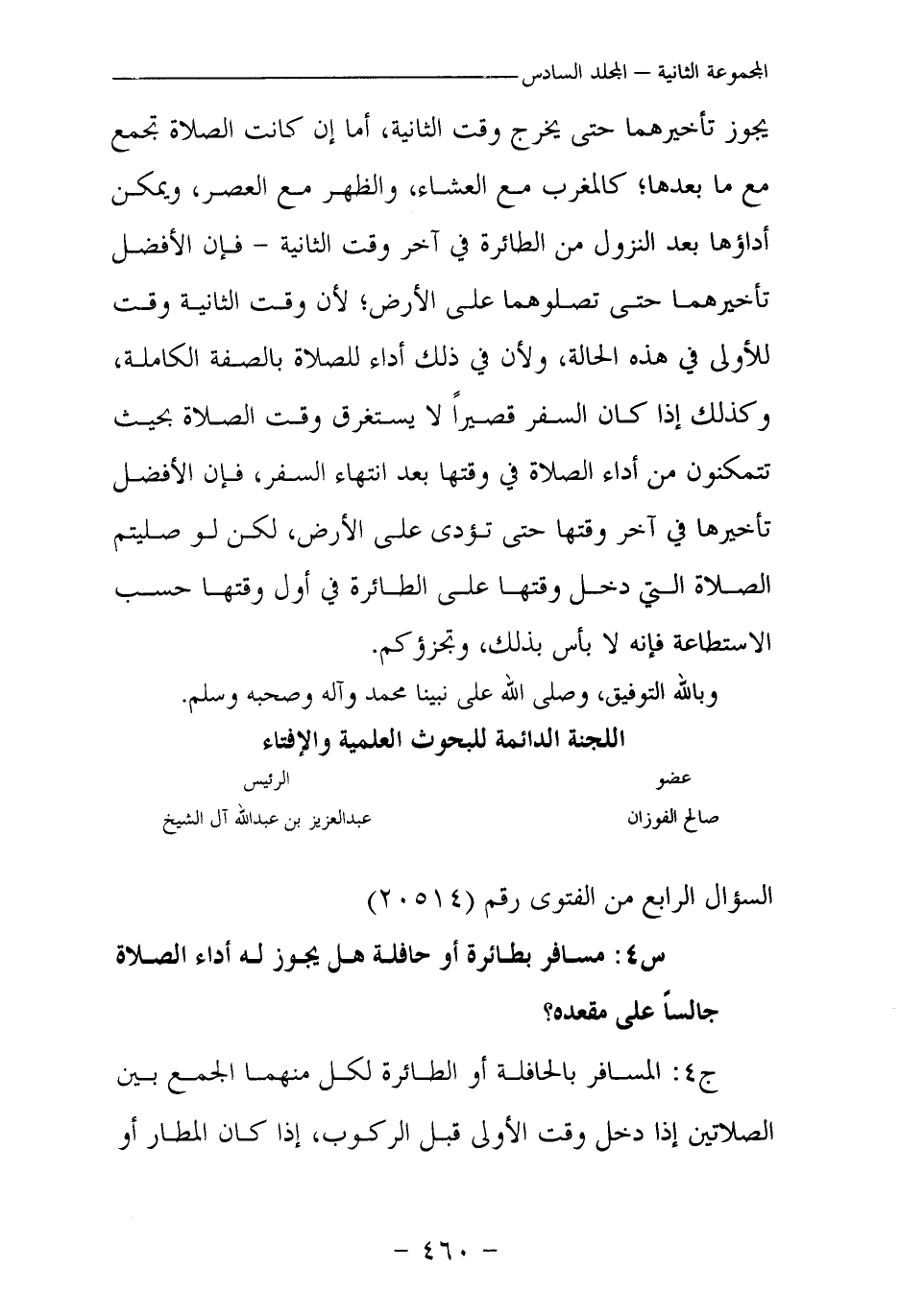 س 4: مسافر بطائرة أو حافلة هل يجوز له أداء الصلاة جالسا على مقعده؟