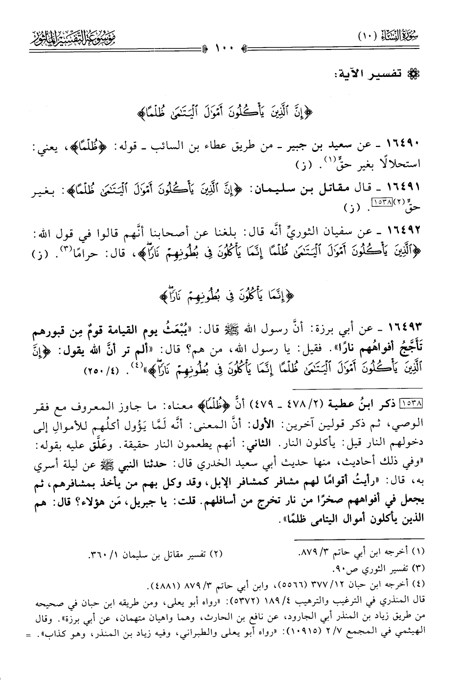 ١٦٤٩٢ - عن سفيان الثوريِّ أنّه قال: بلغنا عن أصحابنا أنّهم قالوا في قول الله: {الذين يأكلون أموال اليتامى ظلما إنما يأكلون في بطونهم نارا}، قال: حرامًا (¬٣). (ز)