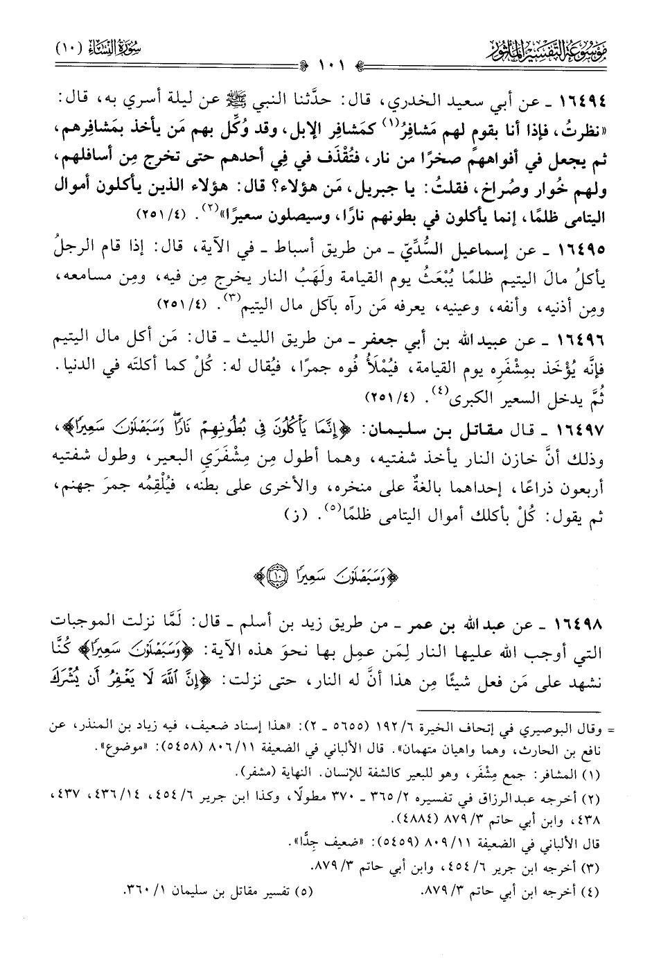 ١٦٤٩٤ - عن أبي سعيد الخدري، قال: حدَّثنا النبي - صلى الله عليه وسلم - عن ليلة أسري به، قال: «نظرتُ، فإذا أنا بقومٍ لهم مَشافِرُ (¬١) كمَشافِر الإبل، وقد وُكِّل بهم مَن يأخذ بمَشافِرهم، ثم يجعل في أفواههم صخرًا من نار، فتُقْذَف في في أحدهم حتى تخرج مِن أسافلهم، ولهم خُوار وصُراخ، فقلتُ: يا جبريل، مَن هؤلاء؟ قال: هؤلاء الذين يأكلون أموال اليتامى ظلمًا، إنما يأكلون في بطونهم نارًا، وسيصلون سعيرًا» (¬٢). (٤/ ٢٥١)
