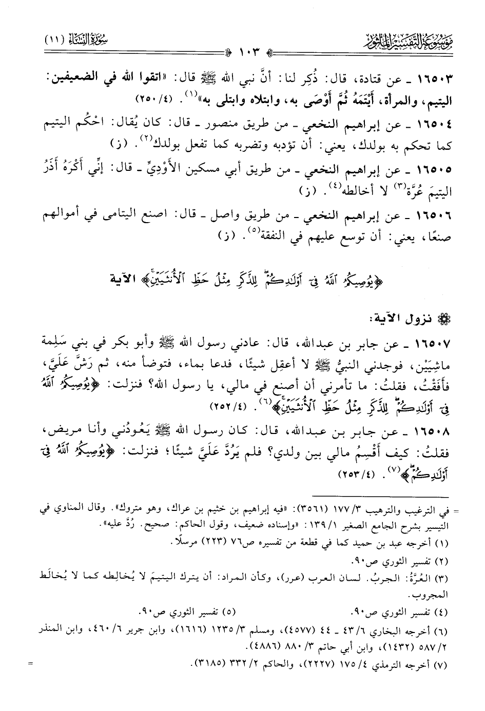 ١٦٥٠٨ - عن جابر بن عبد الله، قال: كان رسول الله - صلى الله عليه وسلم - يَعُودُني وأنا مريض، فقلتُ: كيف أقْسِمُ مالي بين ولدي؟ فلم يَرُدَّ عَلَيَّ شيئًا؛ فنزلت: {يوصيكم الله في أولادكم} (¬٧). (٤/ ٢٥٣)