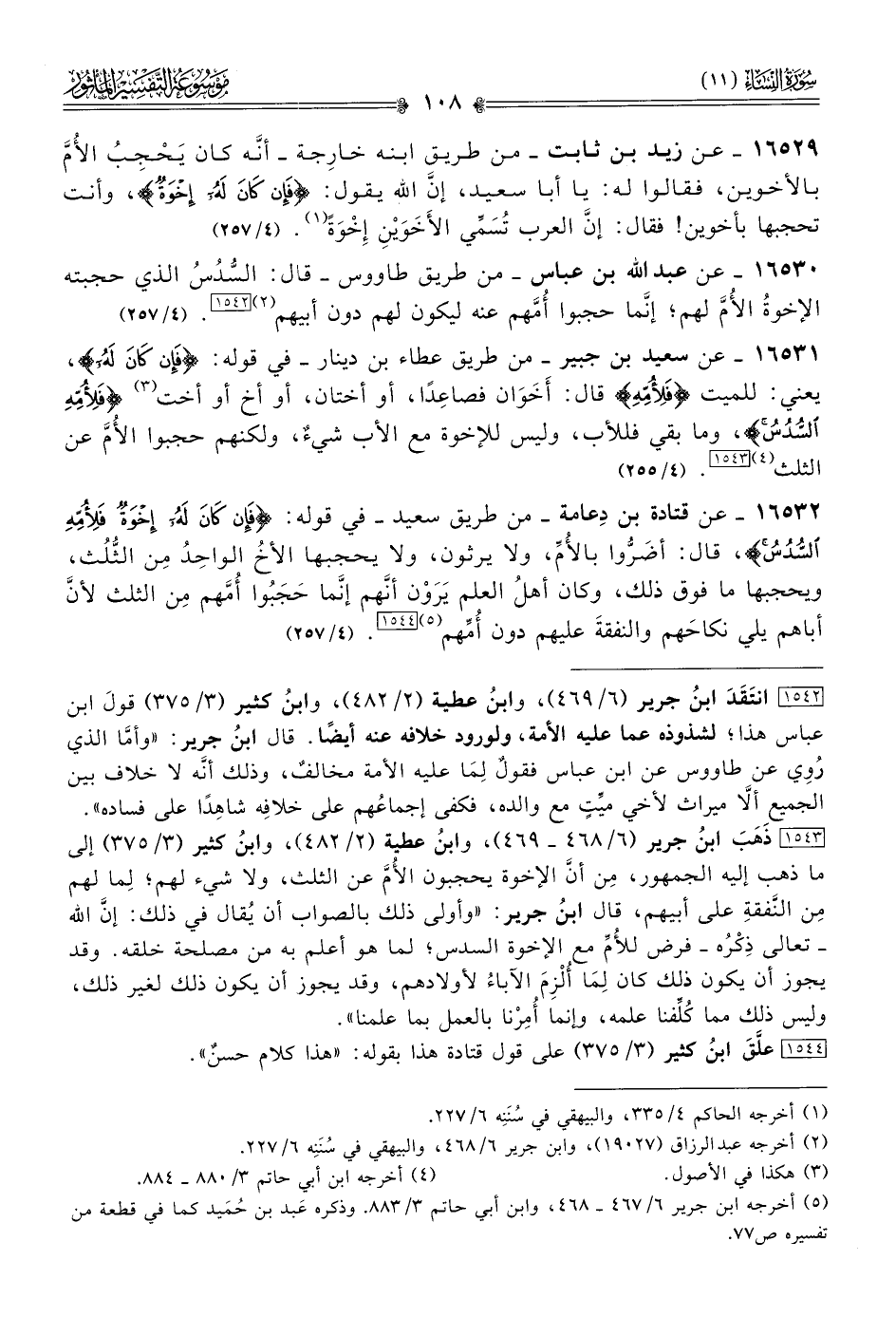 [١٥٤٣] ذَهَبَ ابنُ جرير (٦/ ٤٦٨ - ٤٦٩)، وابنُ عطية (٢/ ٤٨٢)، وابنُ كثير (٣/ ٣٧٥) إلى ما ذهب إليه الجمهور، مِن أنّ الإخوة يحجبون الأُمَّ عن الثلث، ولا شيء لهم؛ لِما لهم مِن النَّفقةِ على أبيهم، قال ابنُ جرير: «وأولى ذلك بالصواب أن يُقال في ذلك: إنّ الله -تعالى ذِكْرُه- فرض للأُمِّ مع الإخوة السدس؛ لما هو أعلم به من مصلحة خلقه. وقد يجوز أن يكون ذلك كان لِما أُلْزِمَ الآباءُ لأولادهم، وقد يجوز أن يكون ذلك لغير ذلك، وليس ذلك مما كُلِّفنا علمه، وإنما أُمِرْنا بالعمل بما علمنا».