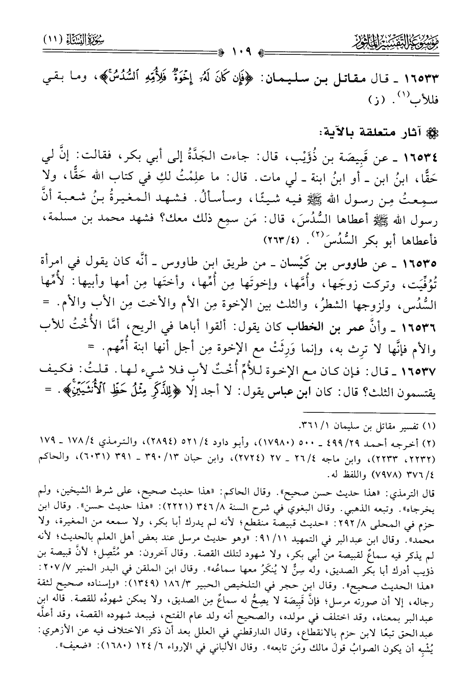 ١٦٥٣٤ - عن قَبِيصَة بن ذُؤَيْب، قال: جاءت الجَدَّةُ إلى أبي بكر، فقالت: إنّ لي حَقًّا، ابنُ ابن -أو ابنُ ابنة- لي مات. قال: ما علِمْتُ لكِ في كتاب الله حَقًّا، ولا سمِعتُ مِن رسول الله - صلى الله عليه وسلم - فيه شيئًا، وسأسألُ. فشهد المغيرةُ بنُ شعبة أنّ رسول الله - صلى الله عليه وسلم - أعطاها السُّدُسَ، قال: مَن سمِع ذلك معك؟ فشهد محمد بن مسلمة، فأعطاها أبو بكر السُّدُسَ (¬٢). (٤/ ٢٦٣)