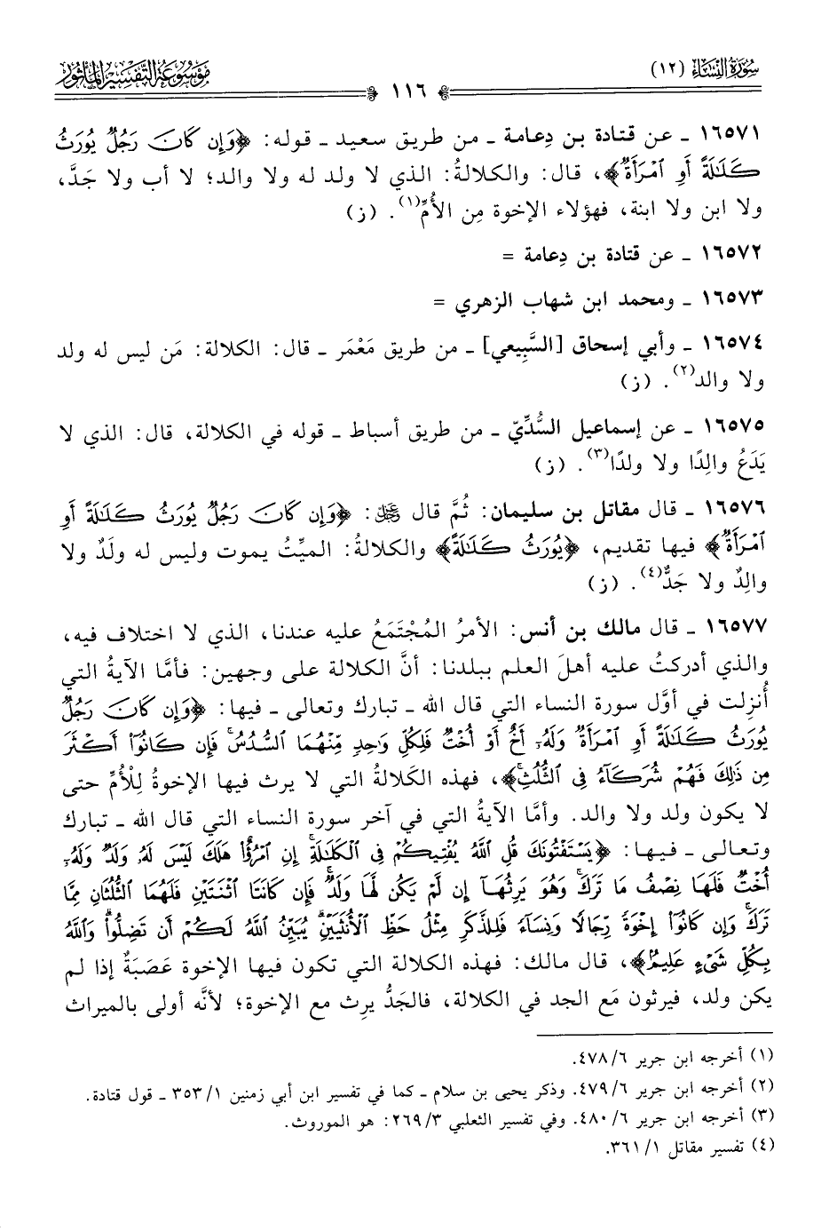 ١٦٥٧١ - عن قتادة بن دِعامة -من طريق سعيد- قوله: {وإن كان رجل يورث كلالة أو امرأة}، قال: والكلالةُ: الذي لا ولد له ولا والد؛ لا أب ولا جَدَّ، ولا ابن ولا ابنة، فهؤلاء الإخوة مِن الأُمِّ (¬١). (ز)