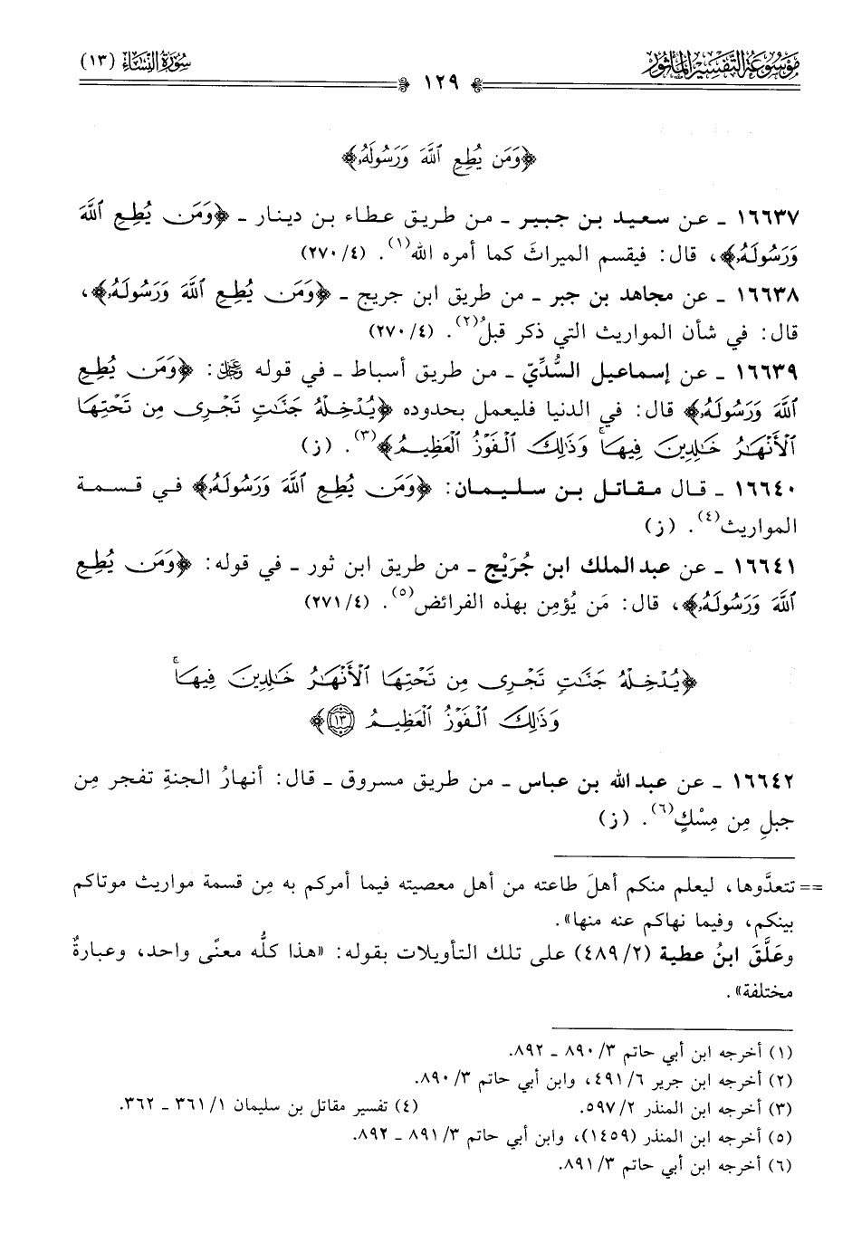 ١٦٦٣٨ - عن مجاهد بن جبر -من طريق ابن جريج- {ومن يطع الله ورسوله}، قال: في شأن المواريث التي ذكر قبلُ (¬٢). (٤/ ٢٧٠)