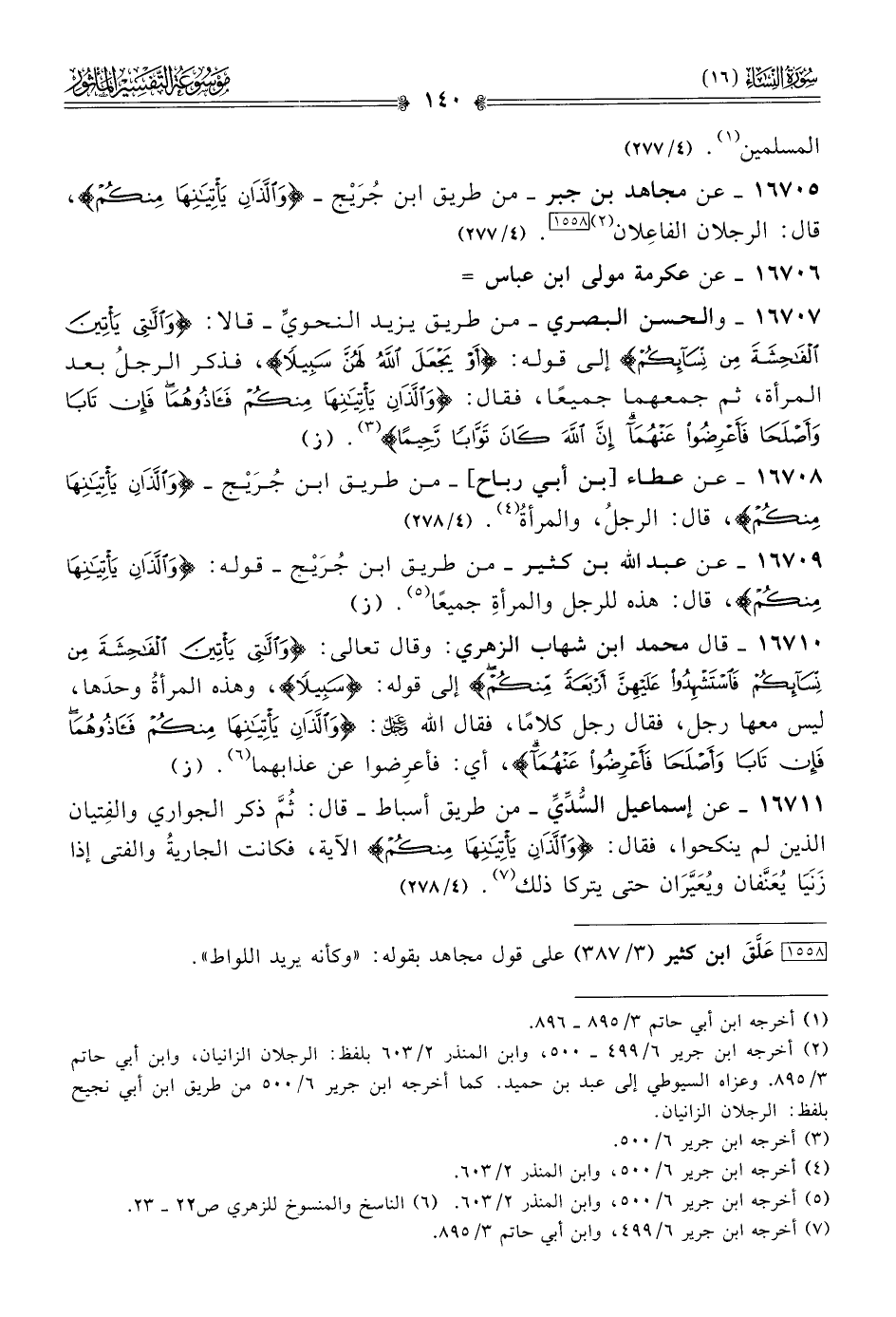 ١٦٧٠٥ - عن مجاهد بن جبر -من طريق ابن جُرَيْج- {واللذان يأتيانها منكم}، قال: الرجلان الفاعِلان (¬٢) [١٥٥٨]. (٤/ ٢٧٧)