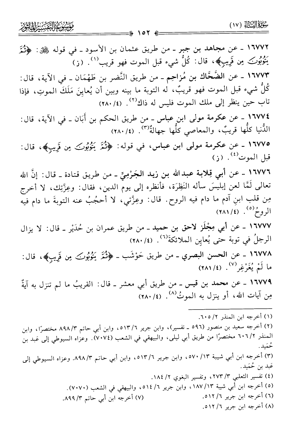 ١٦٧٧٢ - عن مجاهد بن جبر -من طريق عثمان بن الأسود- في قوله - عز وجل -: {ثم يتوبون من قريب}، قال: كُلُّ شيء قبل الموت فهو قريب (¬١). (ز)