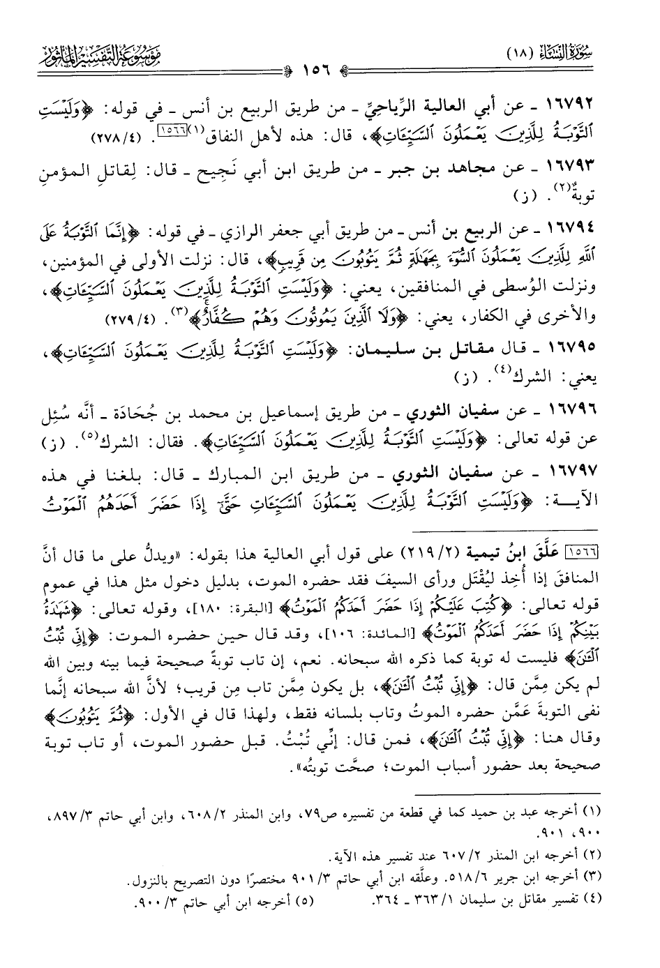 [١٥٦٦] عَلَّقَ ابنُ تيمية (٢/ ٢١٩) على قول أبي العالية هذا بقوله: «ويدلُّ على ما قال أنّ المنافقَ إذا أُخِذ ليُقْتَل ورأى السيفَ فقد حضره الموت، بدليل دخول مثل هذا في عموم قوله تعالى: {كُتِبَ عَلَيْكُمْ إذا حَضَرَ أحَدَكُمُ المَوْتُ} [البقرة: ١٨٠]، وقوله تعالى: {شَهادَةُ بَيْنِكُمْ إذا حَضَرَ أحَدَكُمُ المَوْت} [المائدة: ١٠٦]، وقد قال حين حضره الموت: {إنِّي تُبْتُ الآنَ} فليست له توبة كما ذكره الله سبحانه. نعم، إن تاب توبةً صحيحة فيما بينه وبين الله لم يكن مِمَّن قال: {إنِّي تُبْتُ الآنَ}، بل يكون مِمَّن تاب مِن قريب؛ لأنّ الله سبحانه إنّما نفى التوبةَ عَمَّن حضره الموتُ وتاب بلسانه فقط، ولهذا قال في الأول: {ثُمَّ يَتُوبُونَ} وقال هنا: {إنِّي تُبْتُ الآنَ}، فمن قال: إنِّي تُبْتُ. قبل حضور الموت، أو تاب توبة صحيحة بعد حضور أسباب الموت؛ صحَّت توبتُه».