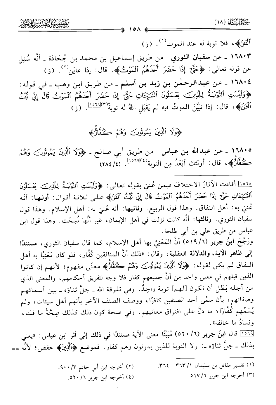 [١٥٦٨] أفادت الآثارُ الاختلافَ فيمن عُنيَ بقوله تعالى: {وليست التوبة للذين يعملون السيئات حتى إذا حضر أحدهم الموت قال إني تبت الآن} على ثلاثة أقوال: أولها: أنّه عُنيَ به: أهل النفاق. وهذا قول الربيع. وثانيها: أنه عُنيَ به: أهل الإسلام. وهذا قول سفيان الثوري. وثالثها: أنّه كانت نزلت في أهل الإيمان، غير أنّها نُسِخَت. وهذا قول ابن عباس من طريق علي بن أبي طلحة.