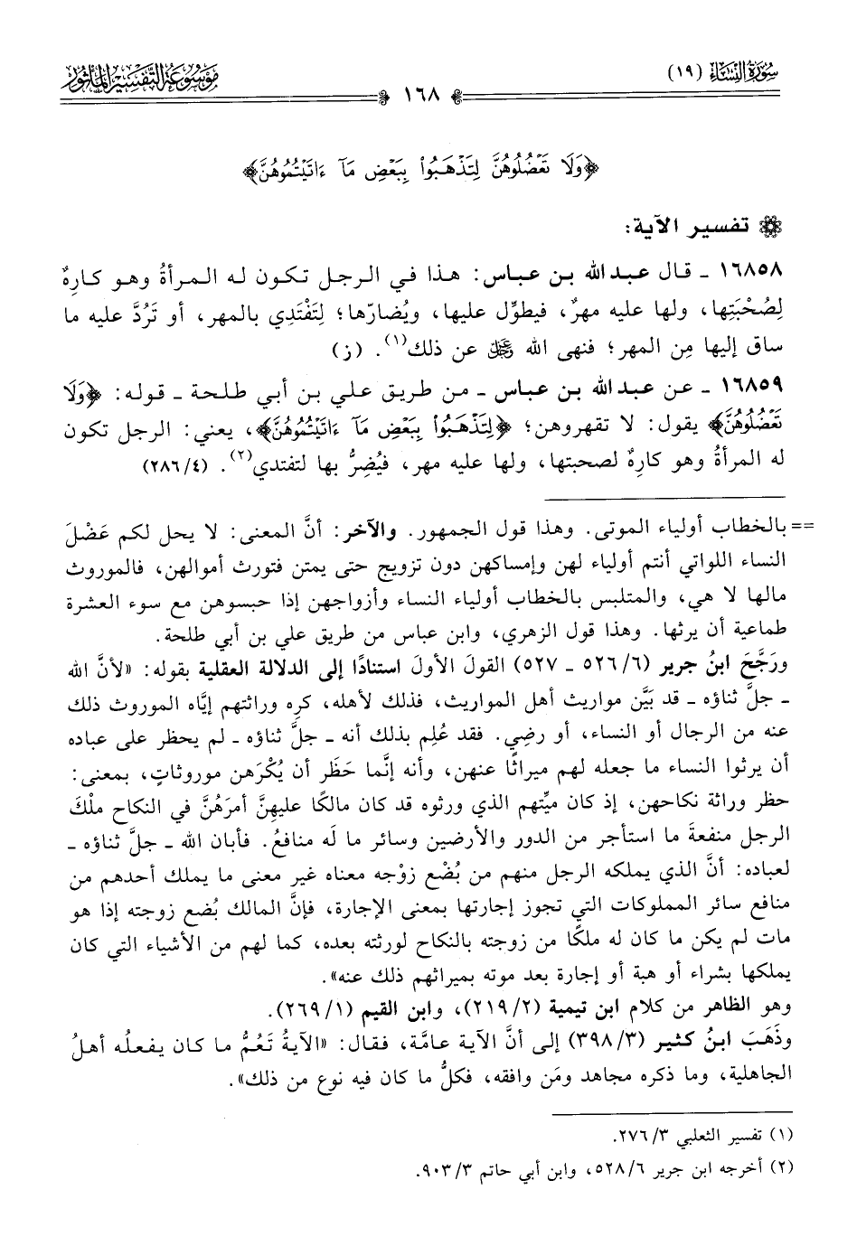١٦٨٥٨ - قال عبد الله بن عباس: هذا في الرجل تكون له المرأةُ وهو كارِهٌ لِصُحْبَتِها، ولها عليه مهرٌ، فيطوّل عليها، ويُضارّها؛ لِتَفْتَدِي بالمهر، أو تردَّ عليه ما ساق إليها مِن المهر؛ فنهى الله - عز وجل - عن ذلك (¬١). (ز)