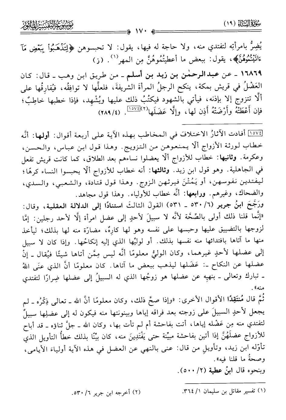 [١٥٧٤] أفادت الآثارُ الاختلافَ في المخاطب بهذه الآية على أربعة أقوال: أولها: أنّه خطاب لورثة الأزواج ألّا يمنعوهن من التزويج. وهذا قول ابن عباس، والحسن، وعكرمة. وثانيها: خطاب للأزواج ألّا يعضلوا نساءهم بعد الطلاق، كما كانت قريش تفعل في الجاهلية. وهو قول ابن زيد. وثالثها: أنه خطاب للأزواج ألّا يحبسوا النساء كرهًا؛ ليفتدين نفوسهن، أو يَمُتْنَ فيرثهن الزوج. وهذا قول قتادة، والشعبي، والسدي، والضحاك، وغيرهم. ورابعها: أنّه خطاب للأولياء. وهذا قول مجاهد.