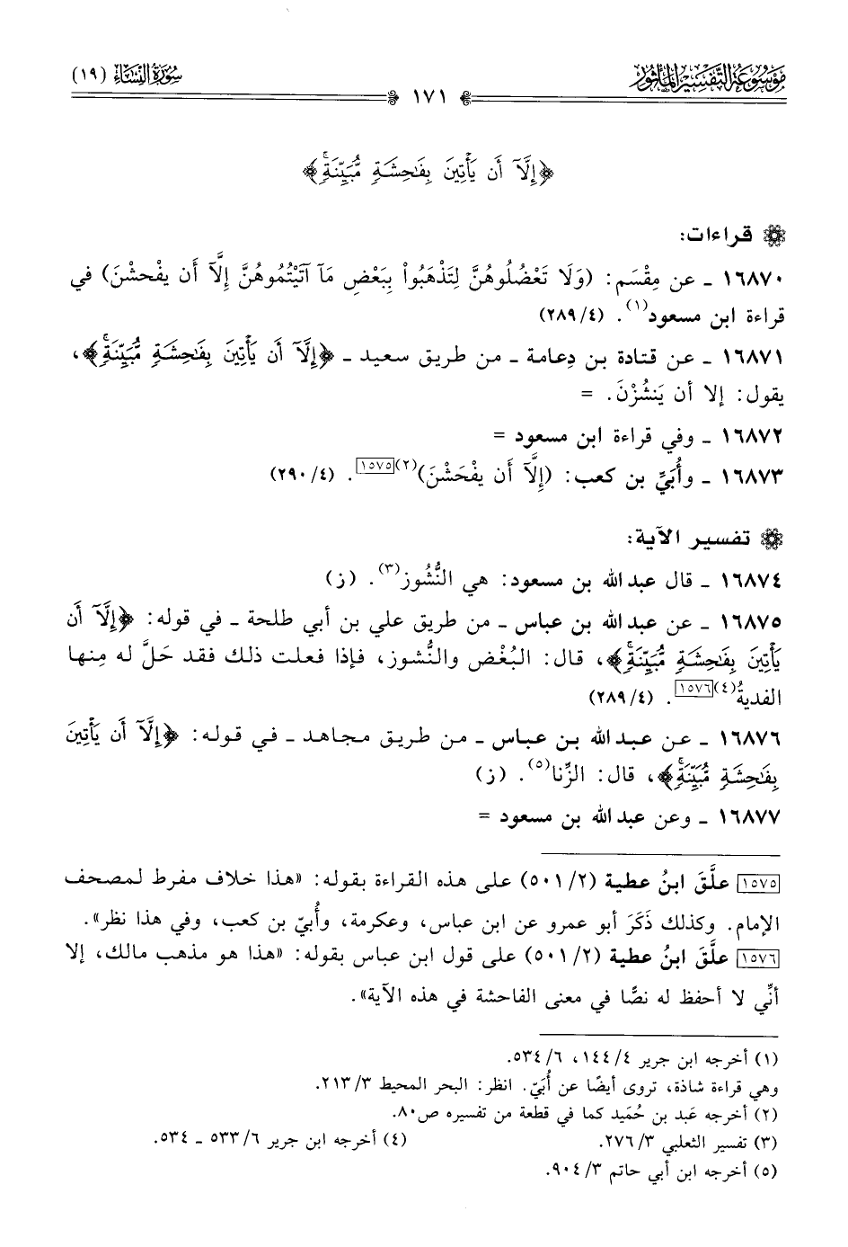 ١٦٨٧٣ - وأُبَيِّ بن كعب: (إلَّآ أن يفْحَشْنَ) (¬٢) [١٥٧٥]. (٤/ ٢٩٠)