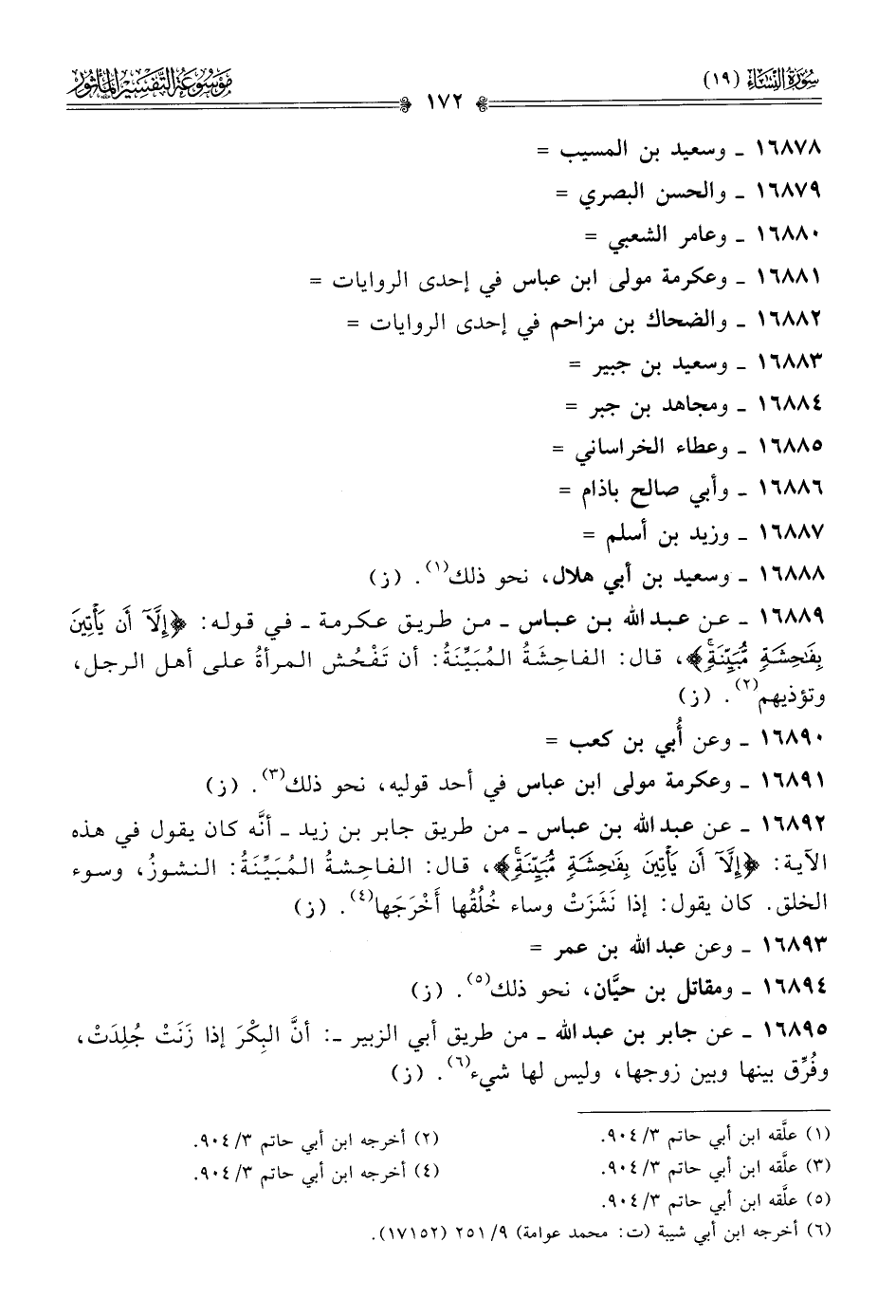 ١٦٨٩٢ - عن عبد الله بن عباس -من طريق جابر بن زيد- أنّه كان يقول في هذه الآية: {إلا أن يأتين بفاحشة مبينة}، قال: الفاحِشةُ المُبَيِّنَةُ: النشوزُ، وسوء الخلق. كان يقول: إذا نَشَزَتْ وساء خُلُقُها أخْرَجَها (¬٤). (ز)